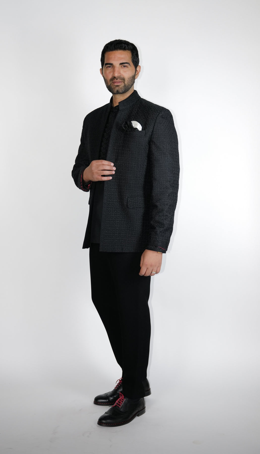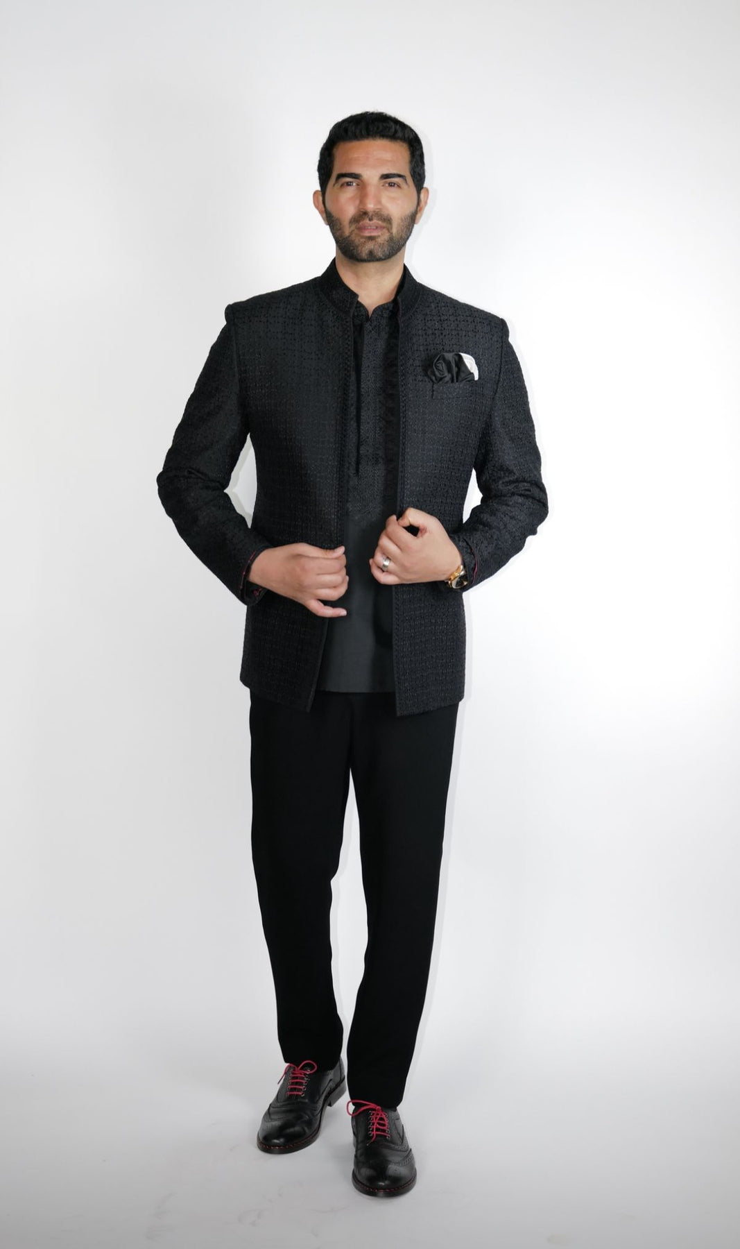 Black spun-silk open style Bundgala with all-over resham Starburst design embroidered, paired with short under Kurta.