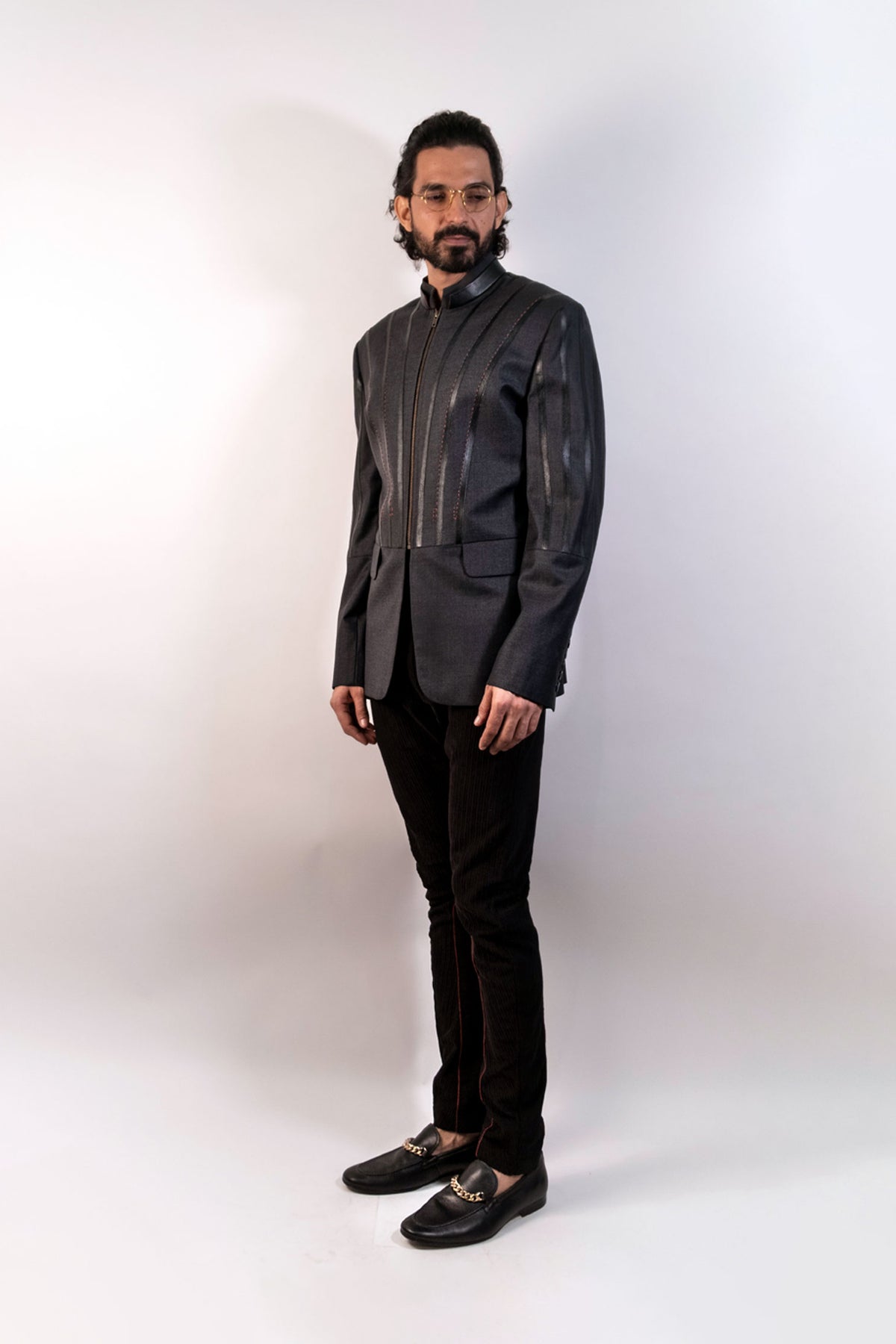 Charcoal Grey light weight wool military inspired Princess Line detail in leather with zipper front and back with double collar in leather.