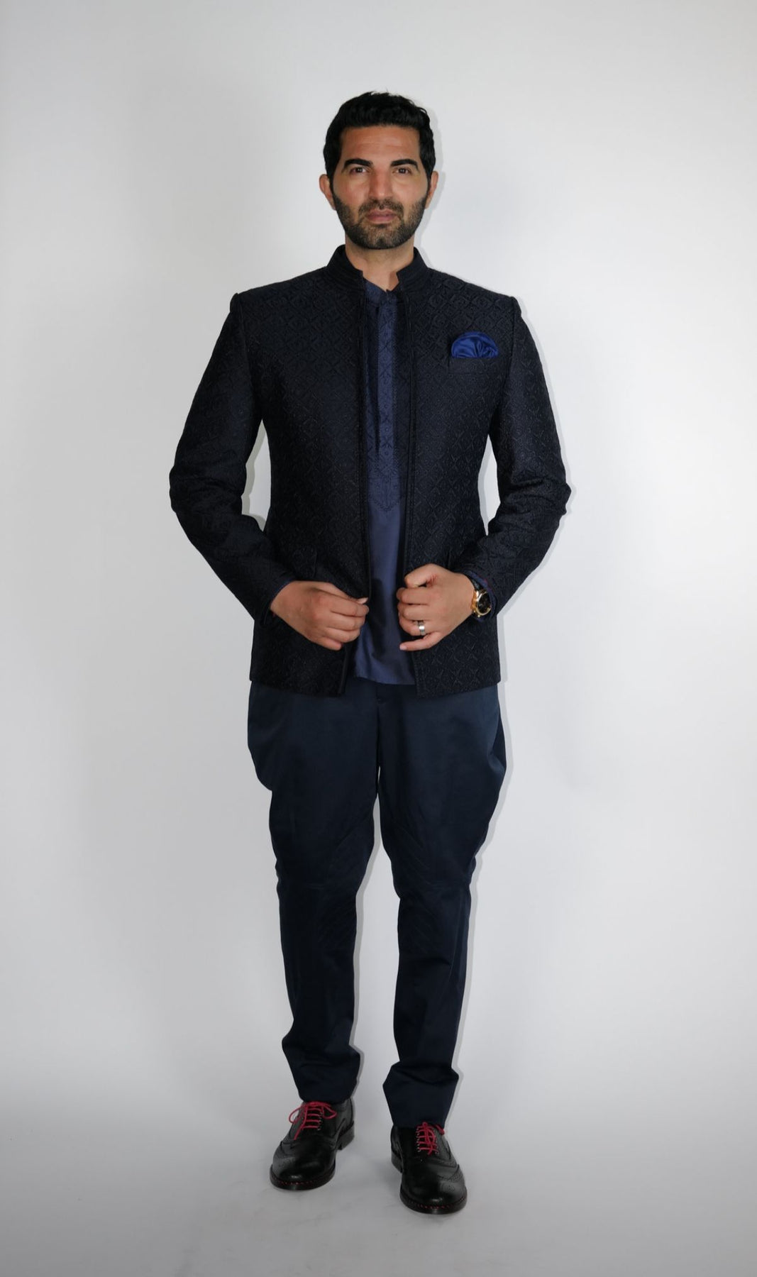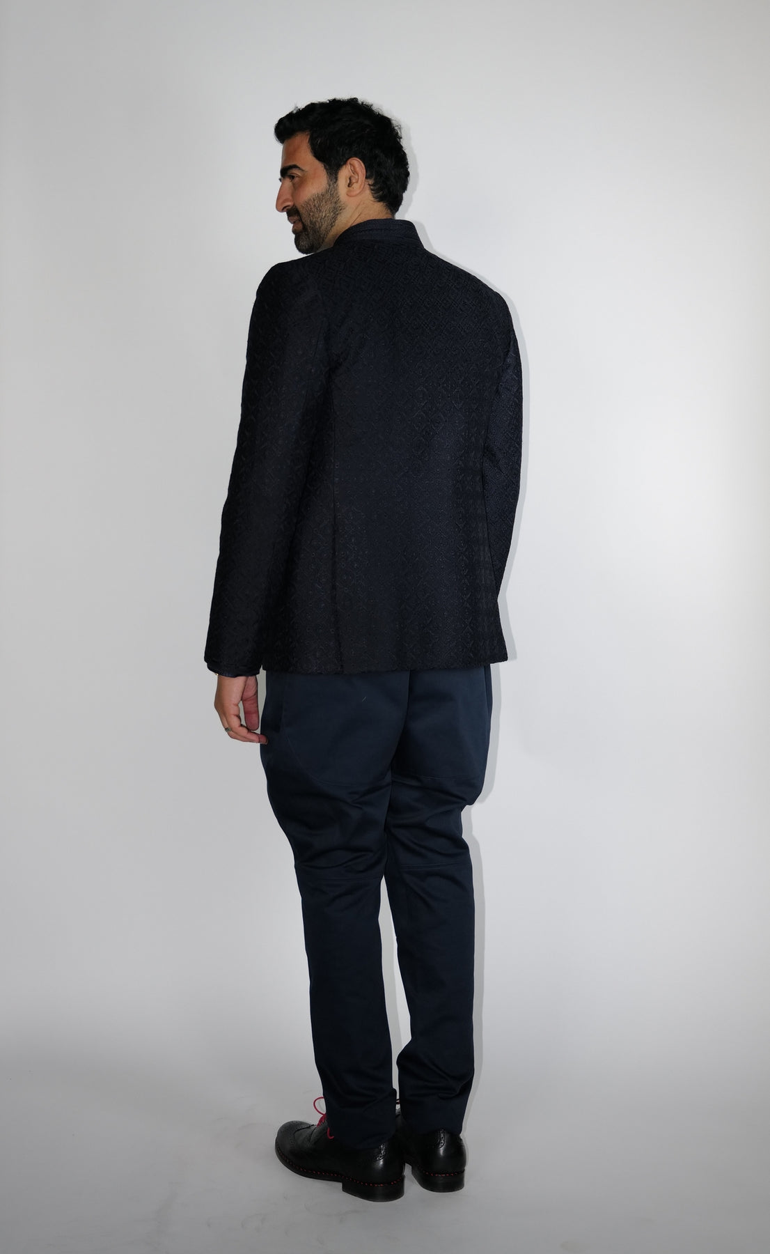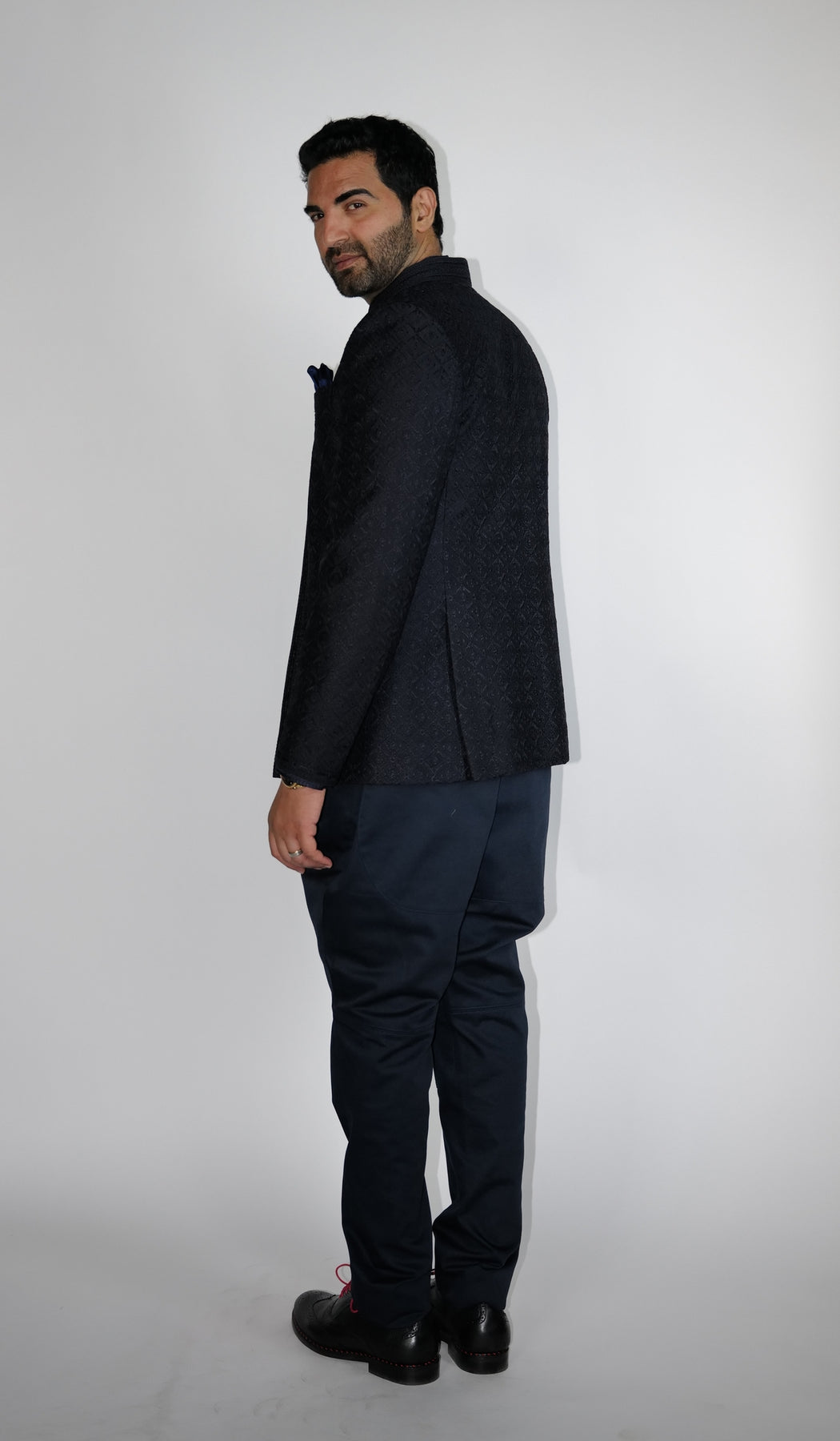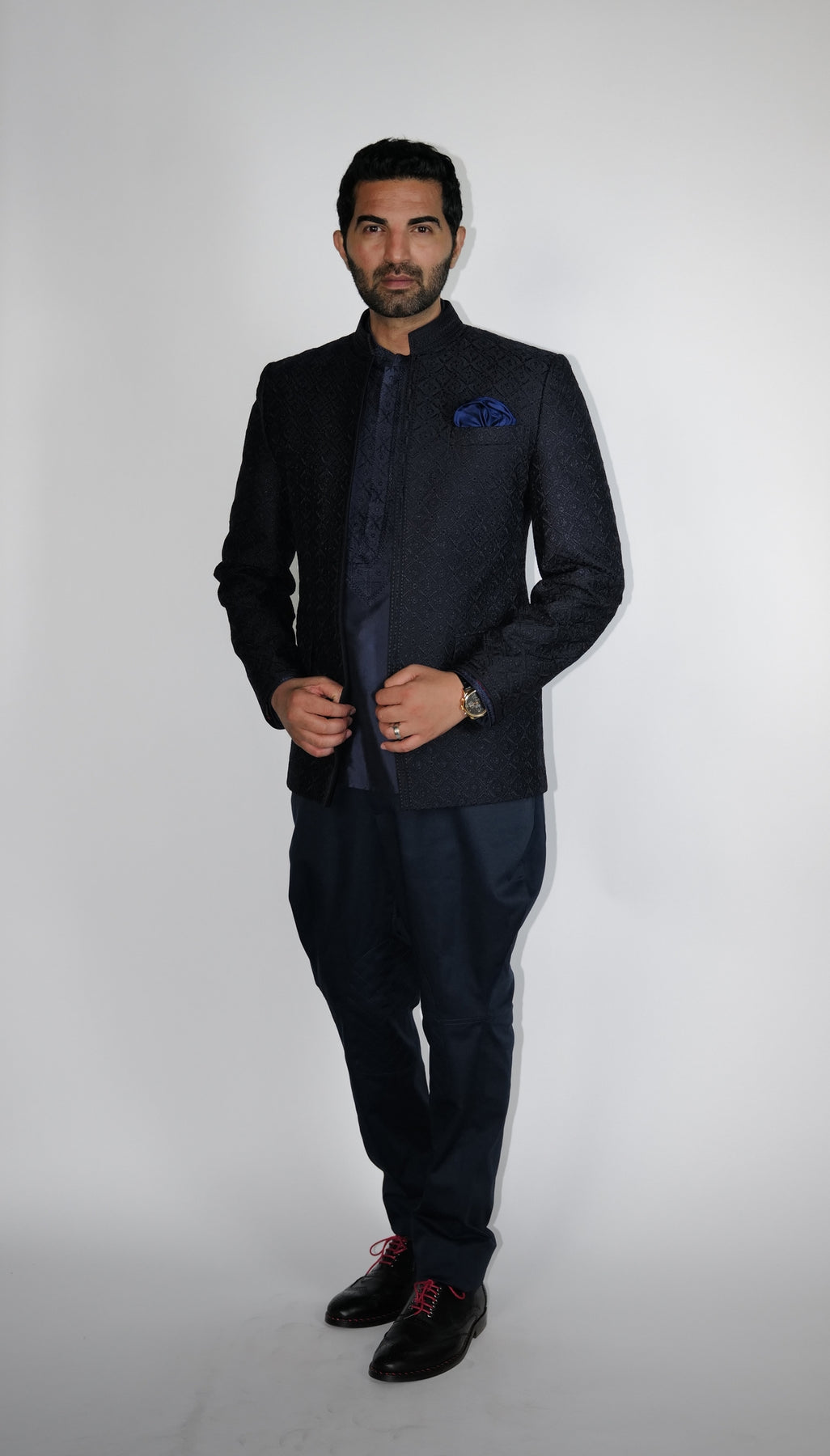 Regular price Rs. 150,000Navy Blue spun-silk open style Bundgala with all-over resham Feather design embroidered, paired with short under Kurta.