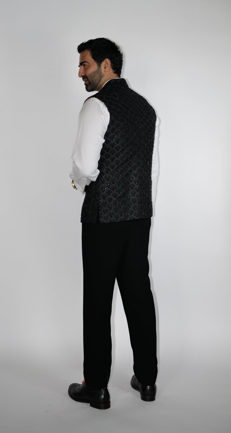 Regular price Rs. 95,000Black spun-silk Bundi with all-over art-deco inspired Fan motif self embroidery & katdana work.
