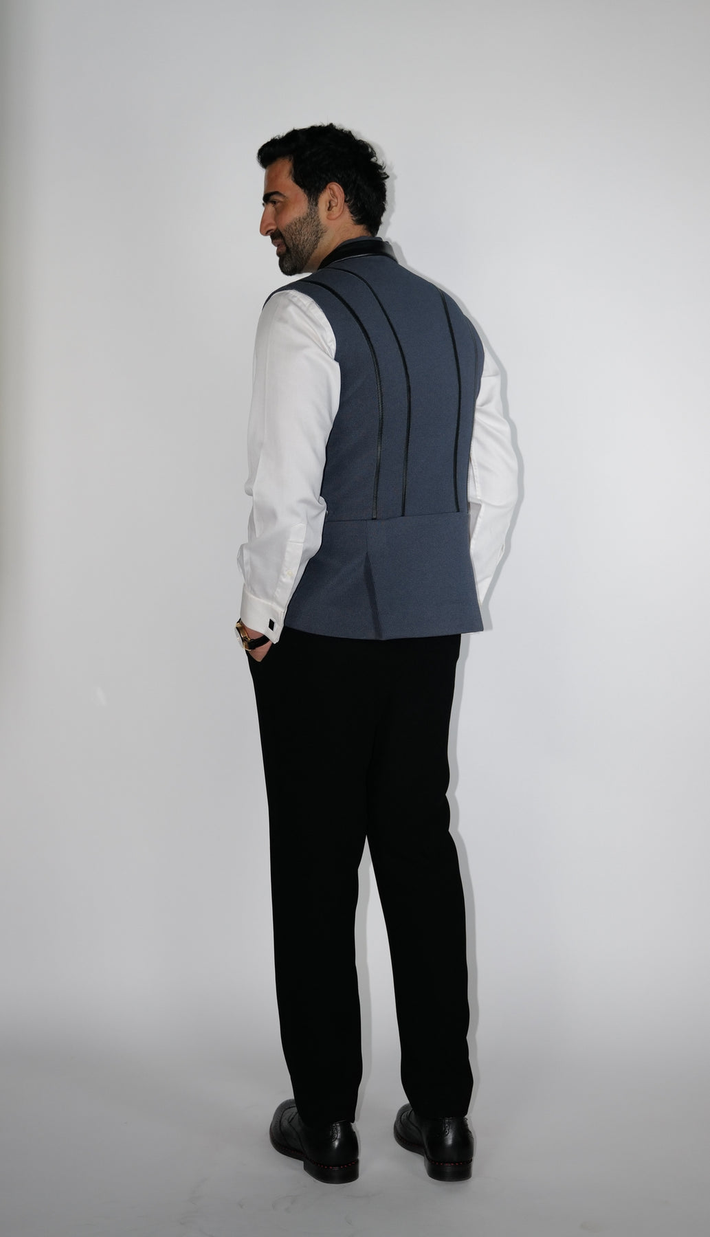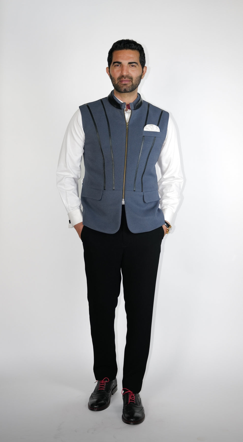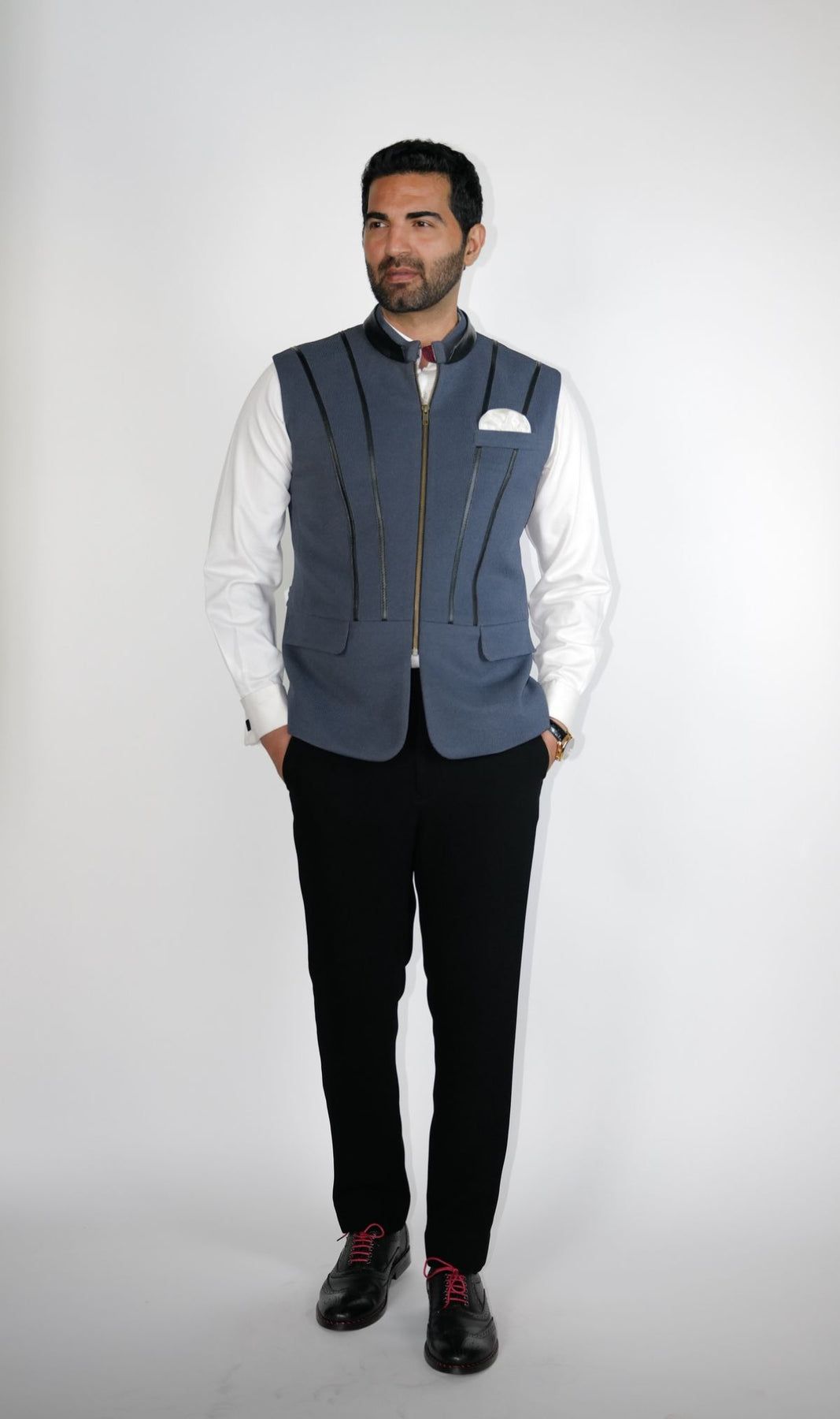 Regular price Rs. 55,000Grey structured Bundi with leather zipper detail on princess line.