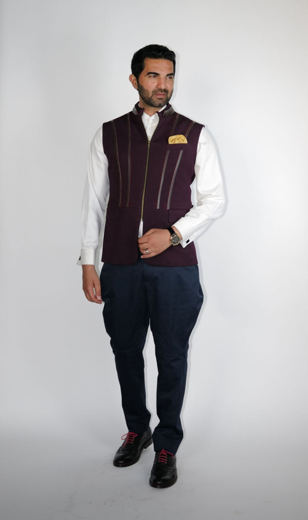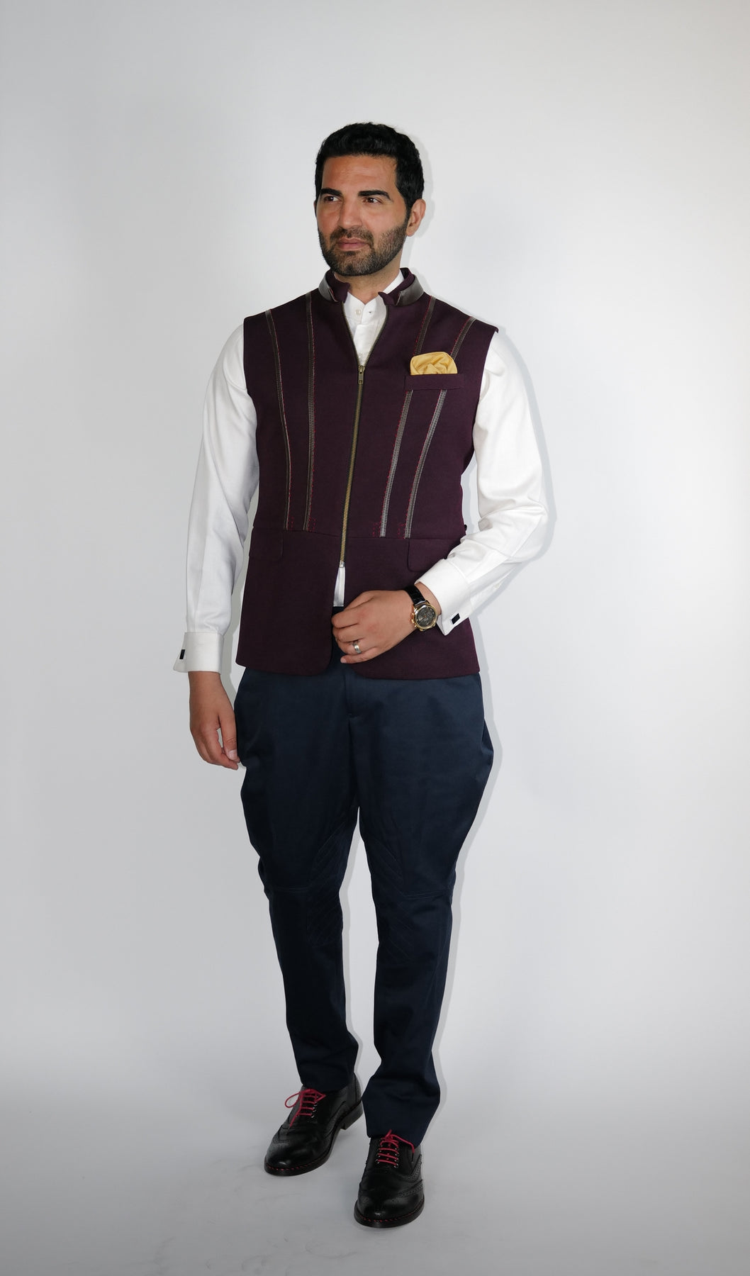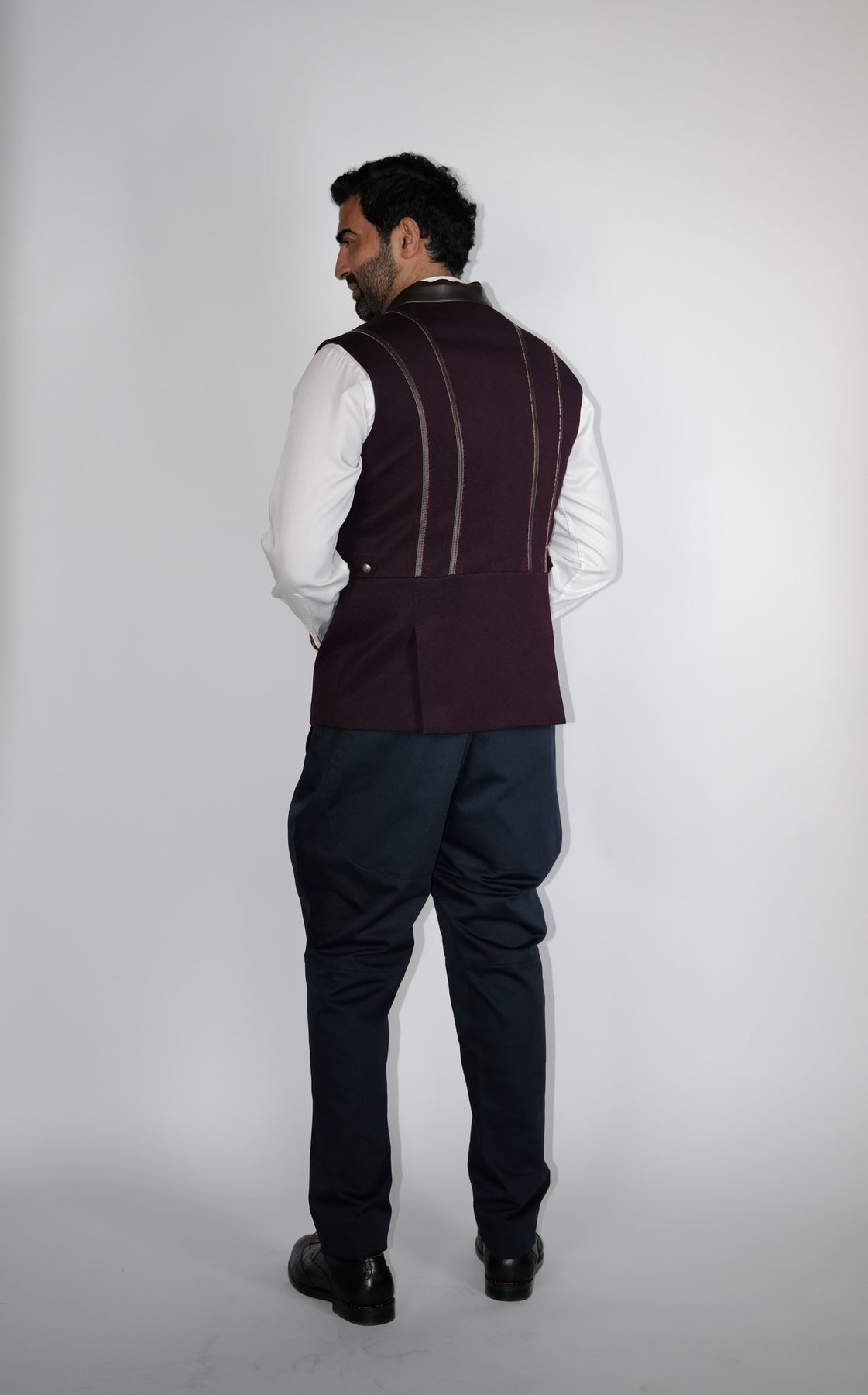 Maroon structured Bundi with leather zipper detail on princess line.
