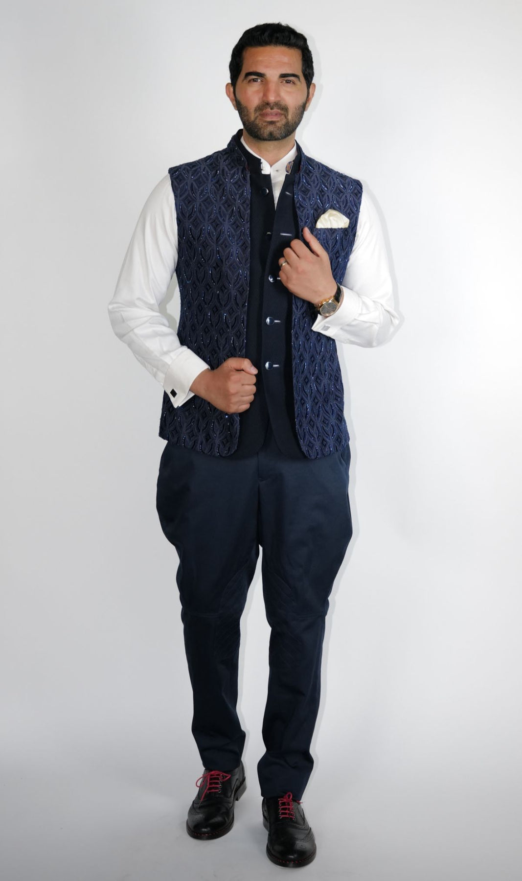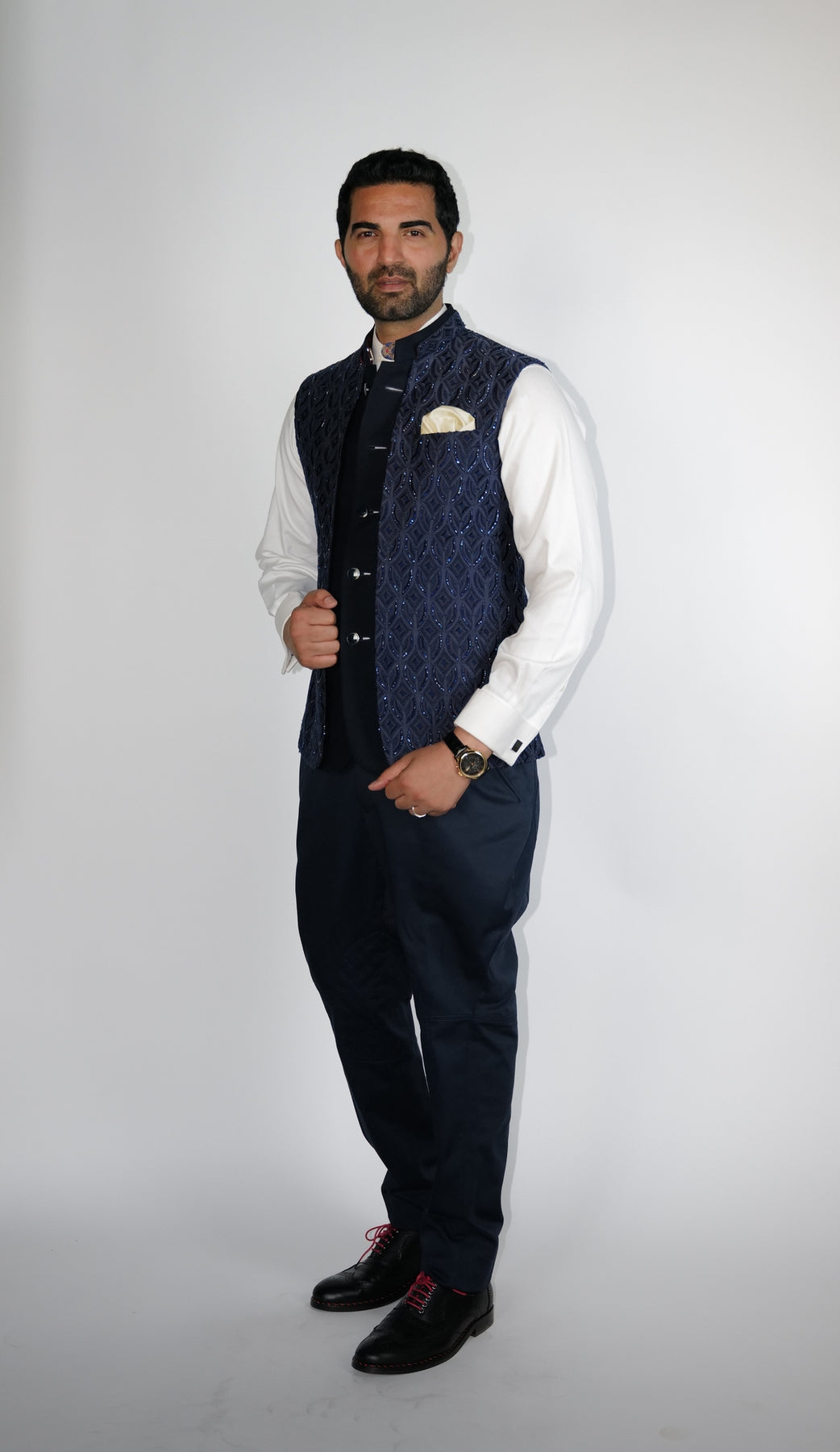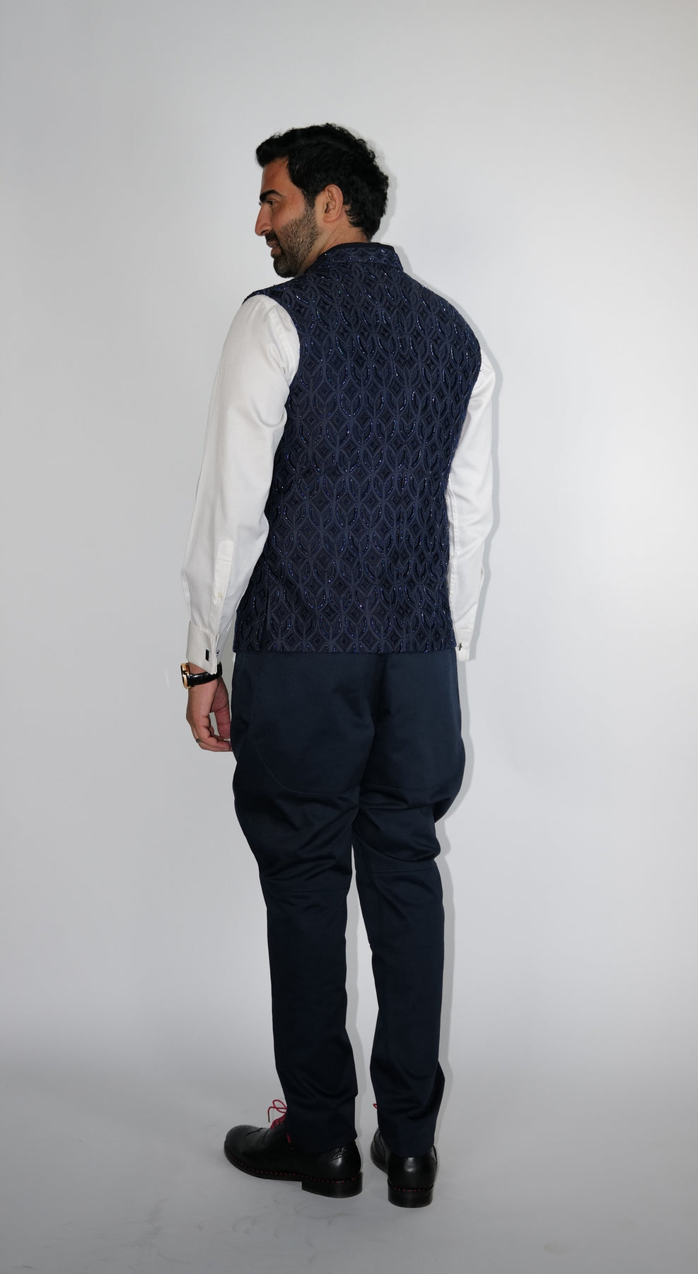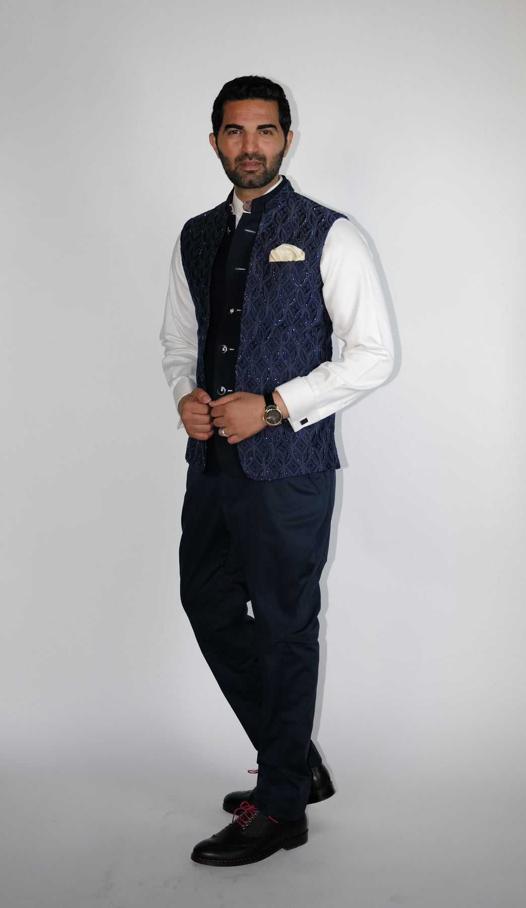 Navy Blue spun-silk double layer Bundi with all-over art-deco inspired peacock motif self embroidery & katdana work.