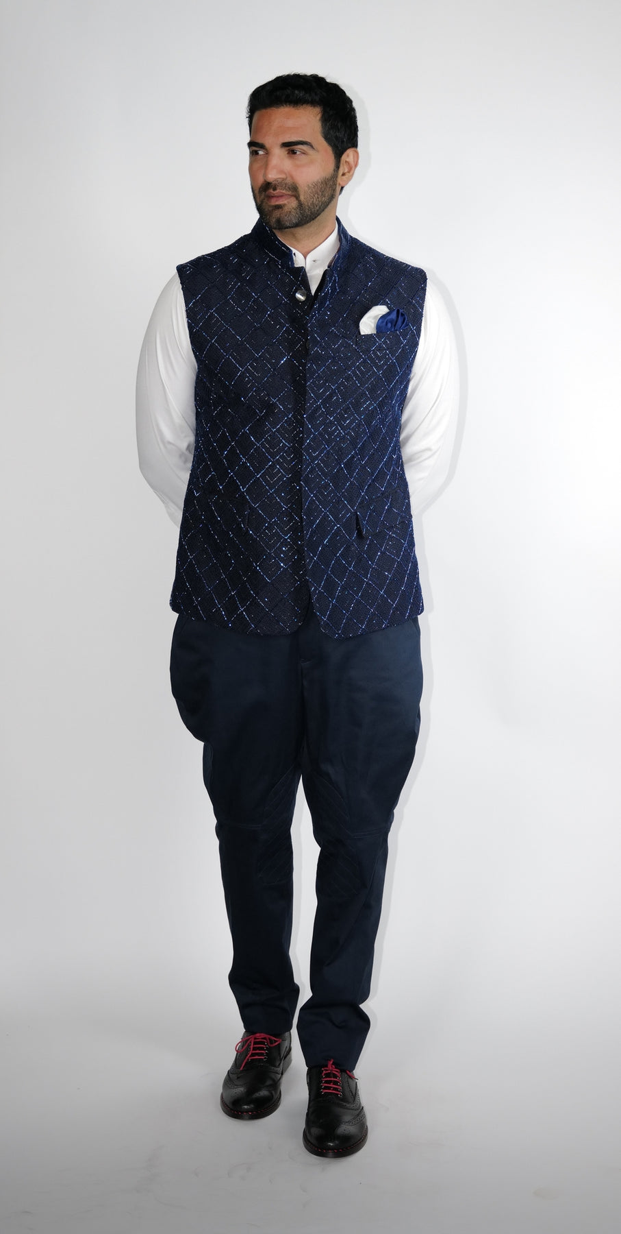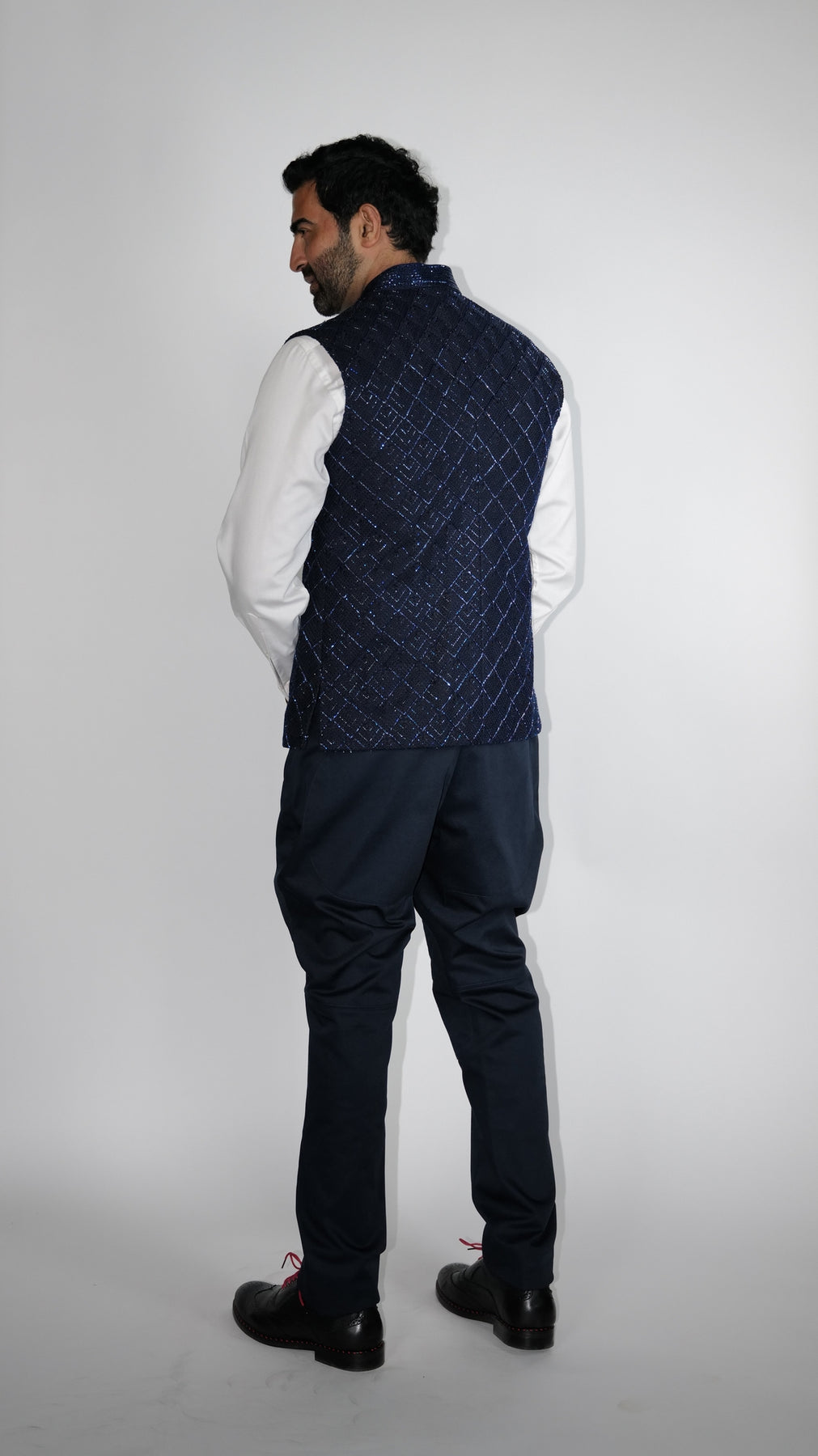 Regular price Rs. 95,000Navy Blue spun-silk Bundi with all-over art-deco inspired stepline motif self embroidery & katdana work.