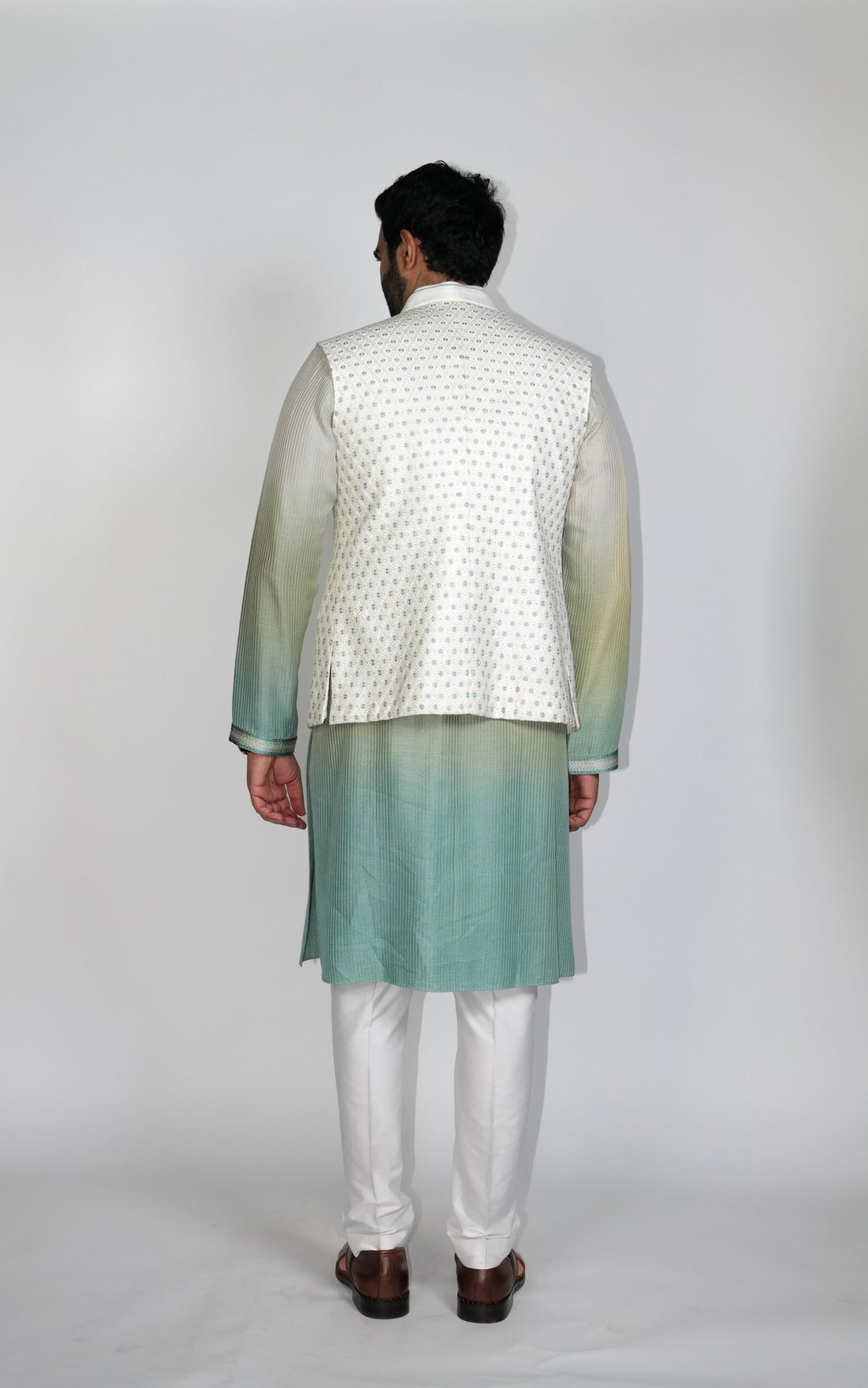 Green Ombre tones small Butta all over resham embroidered Bundi.