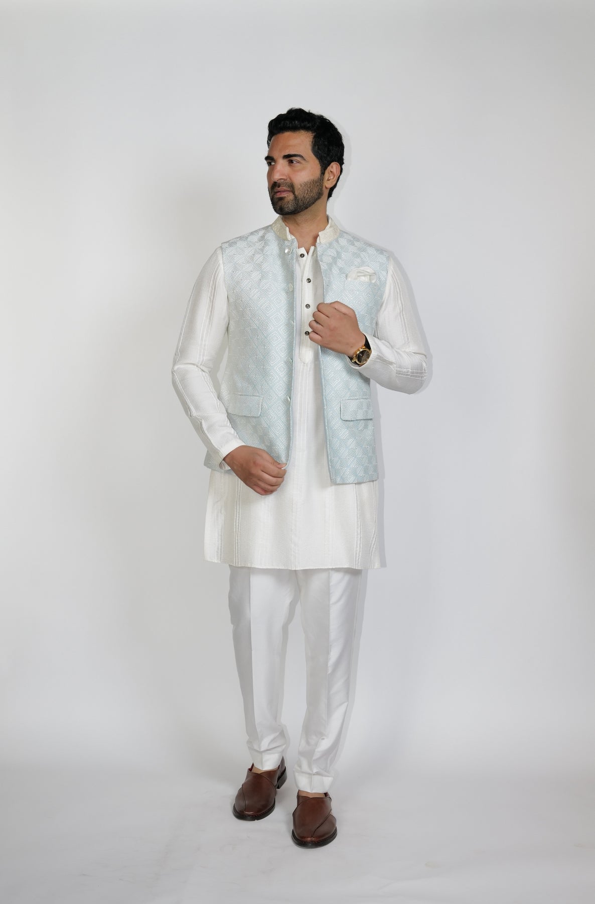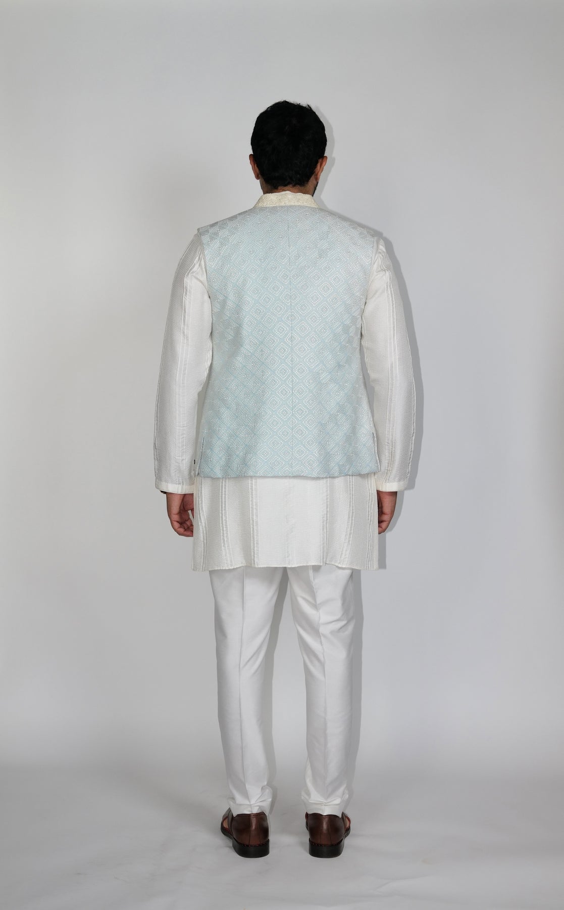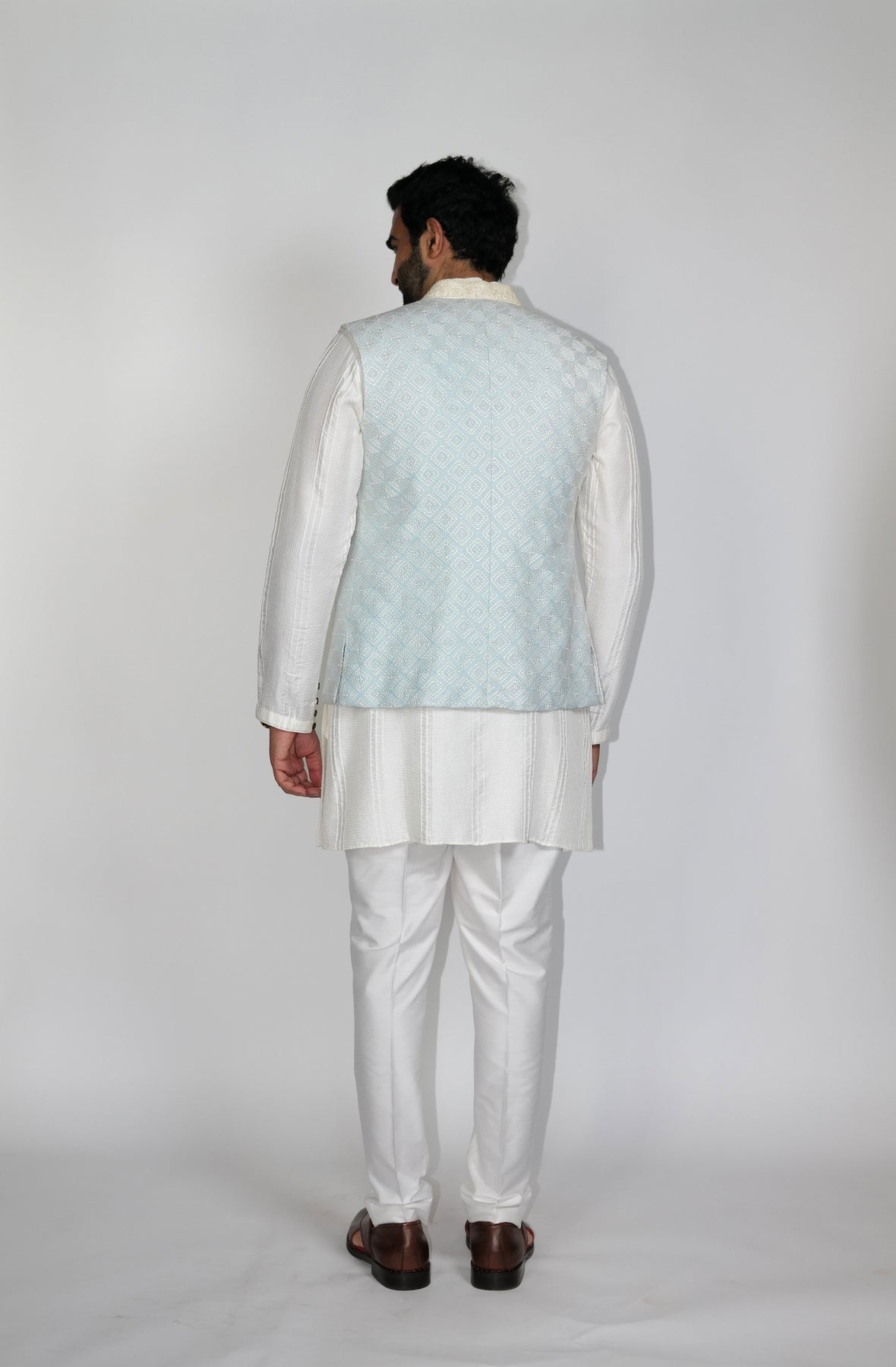 Powder blue square Jacquard all-over resham Phulkari emroidered Bundi