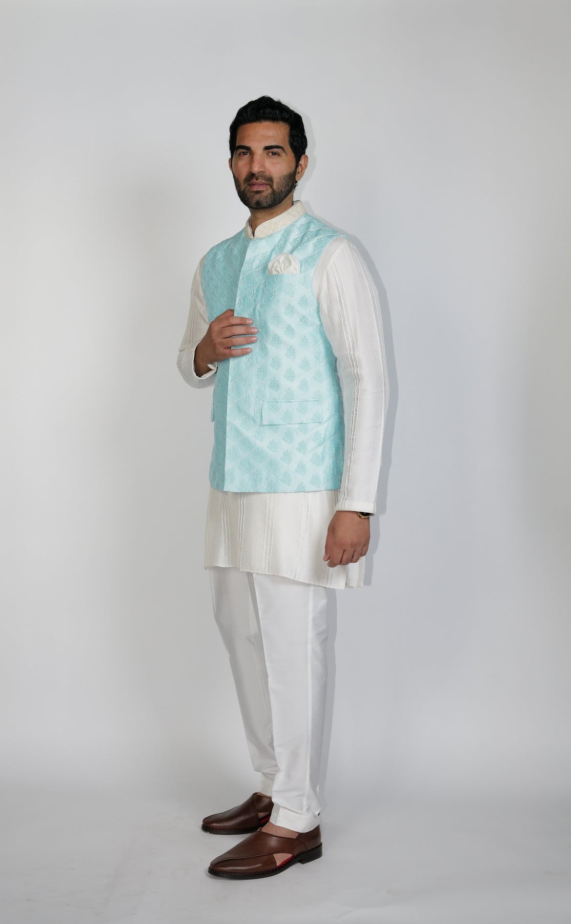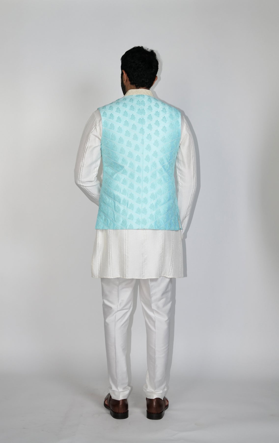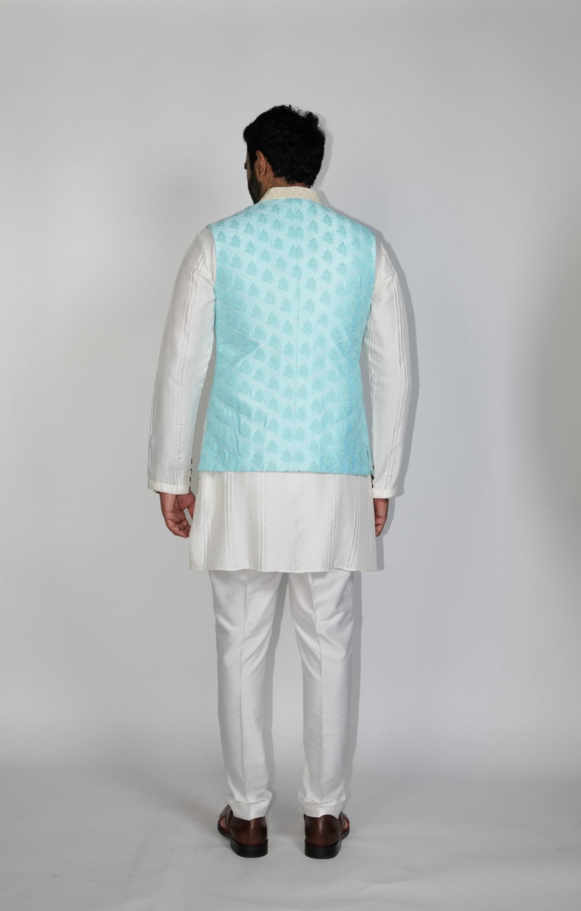Powder Blue quilted Bundi with resham Olive-Green Flower embroidery.