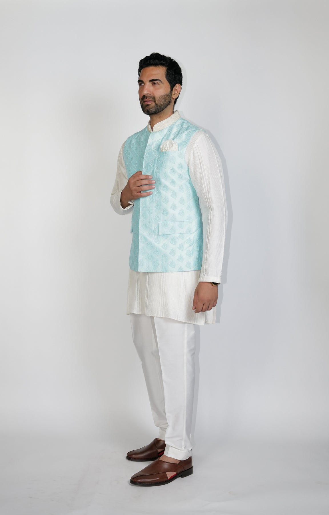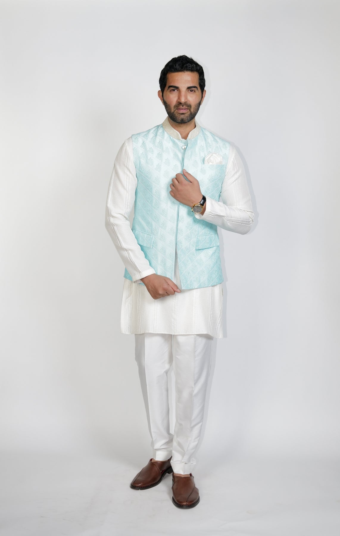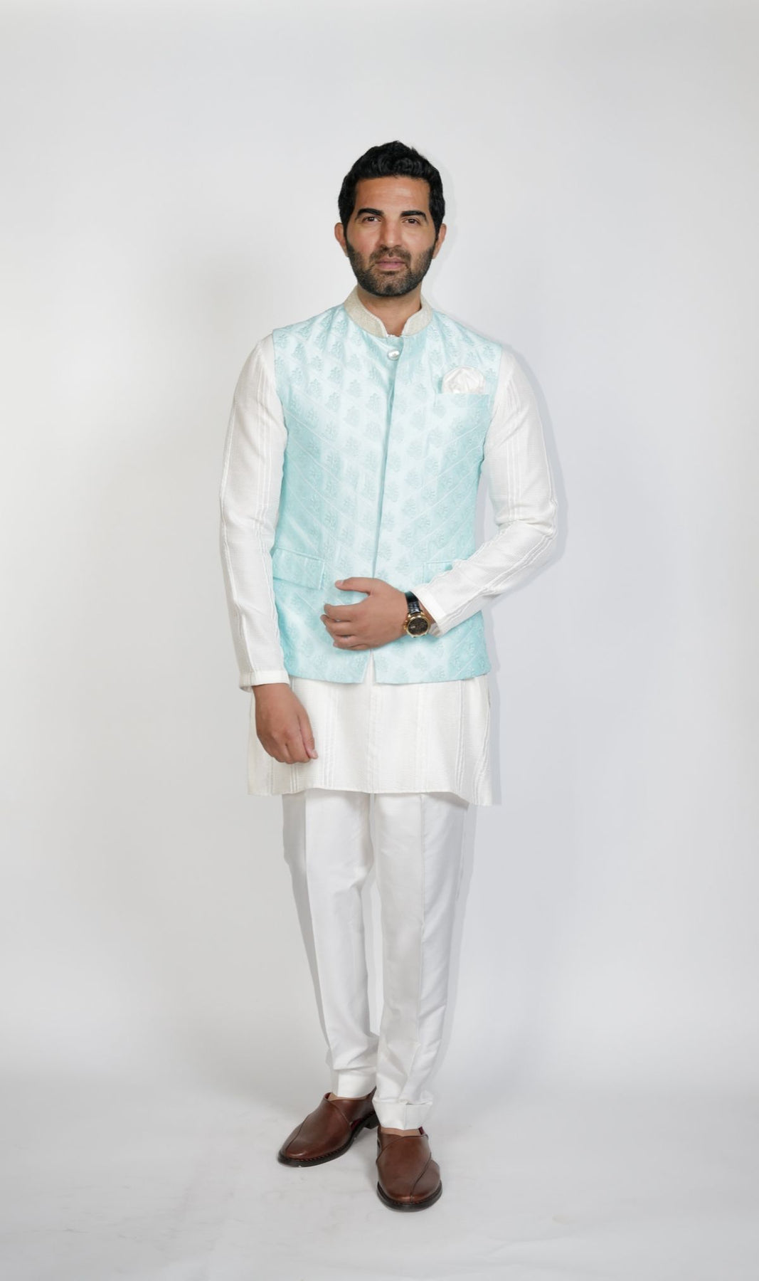 Powder Blue quilted Bundi with resham Olive-Green Flower embroidery.