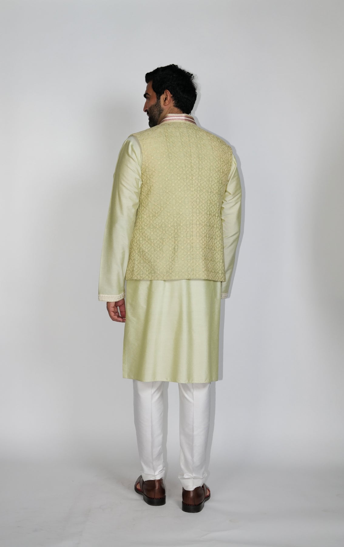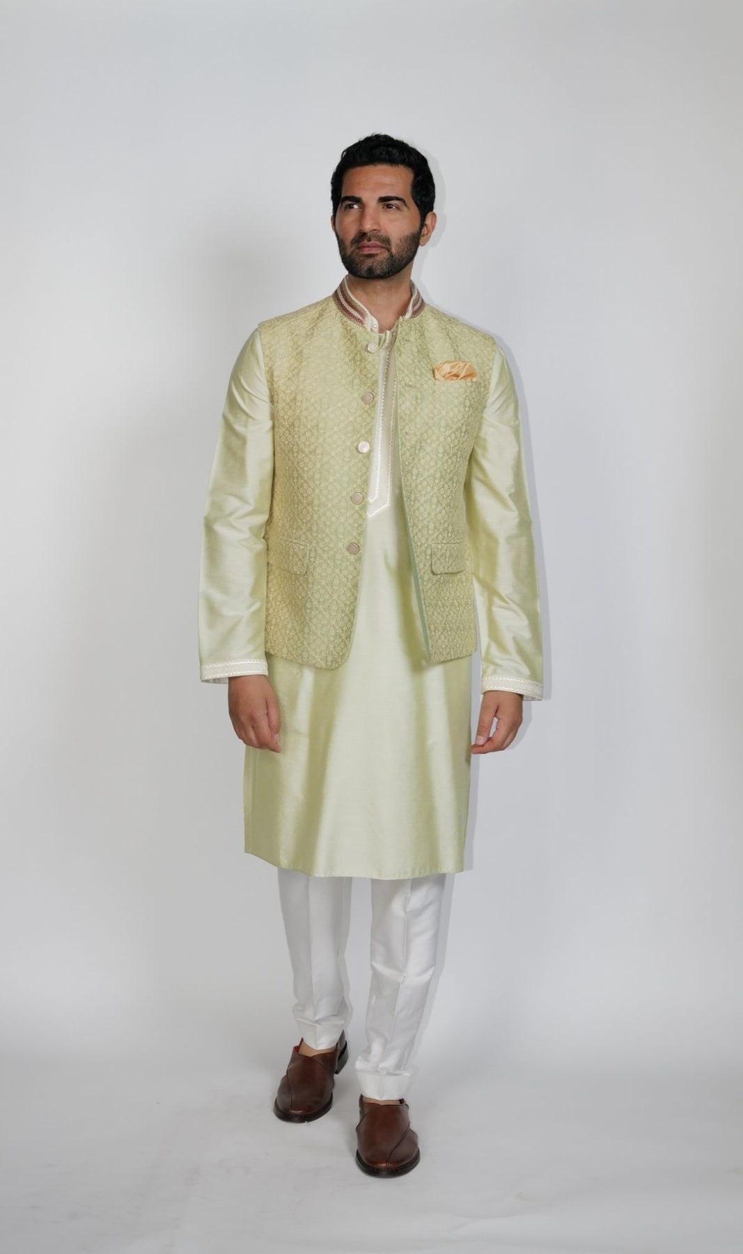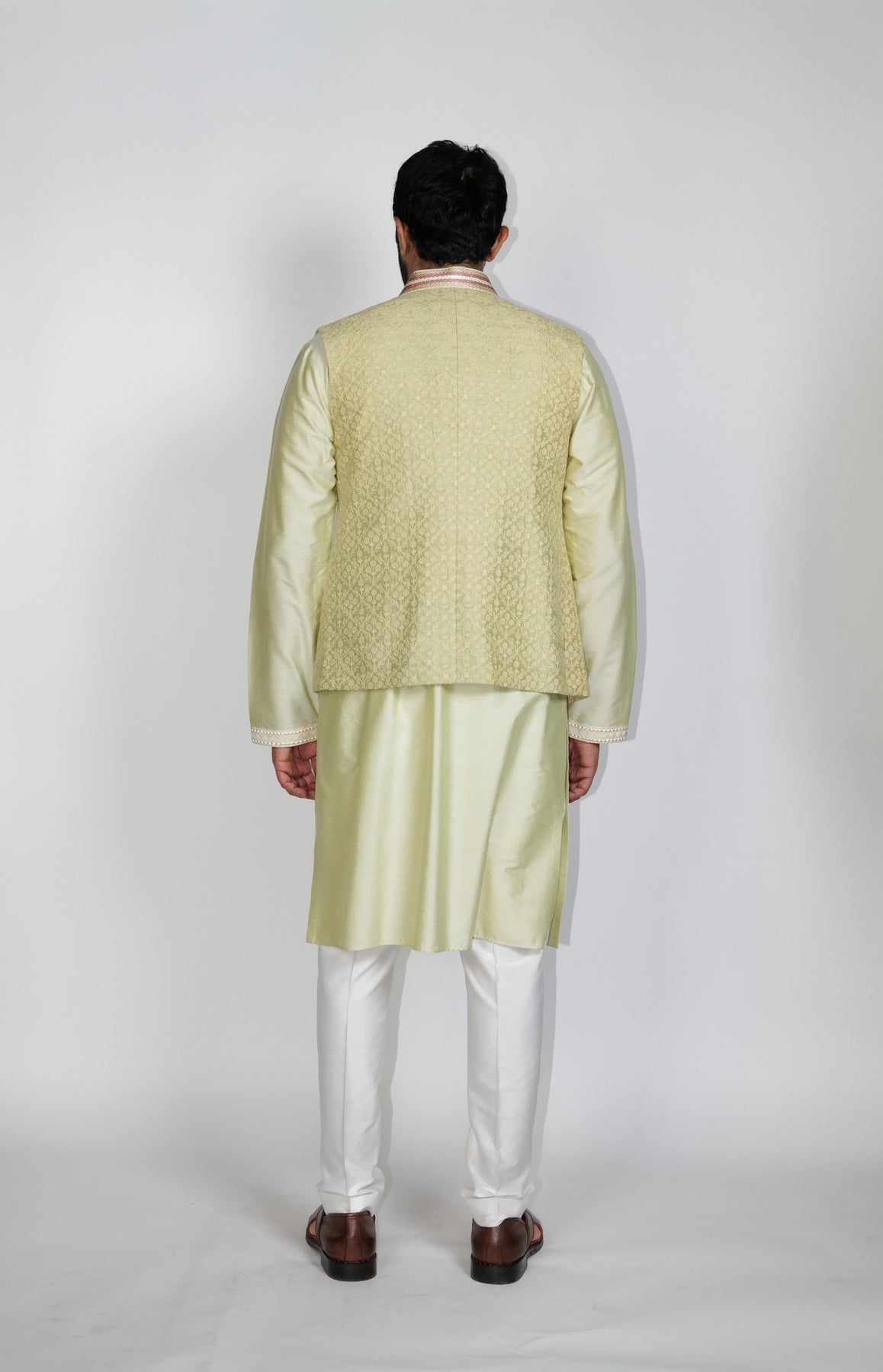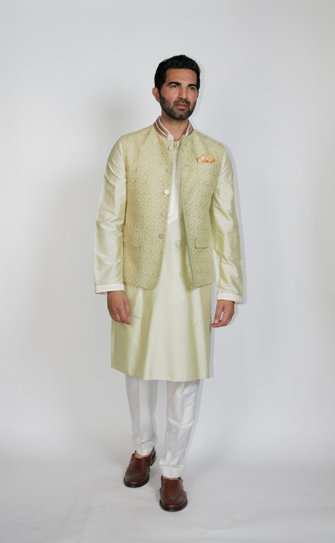 Regular price Rs. 48,000Sage Jacquard all-over resham embroidery Bundi with embroidered collar.