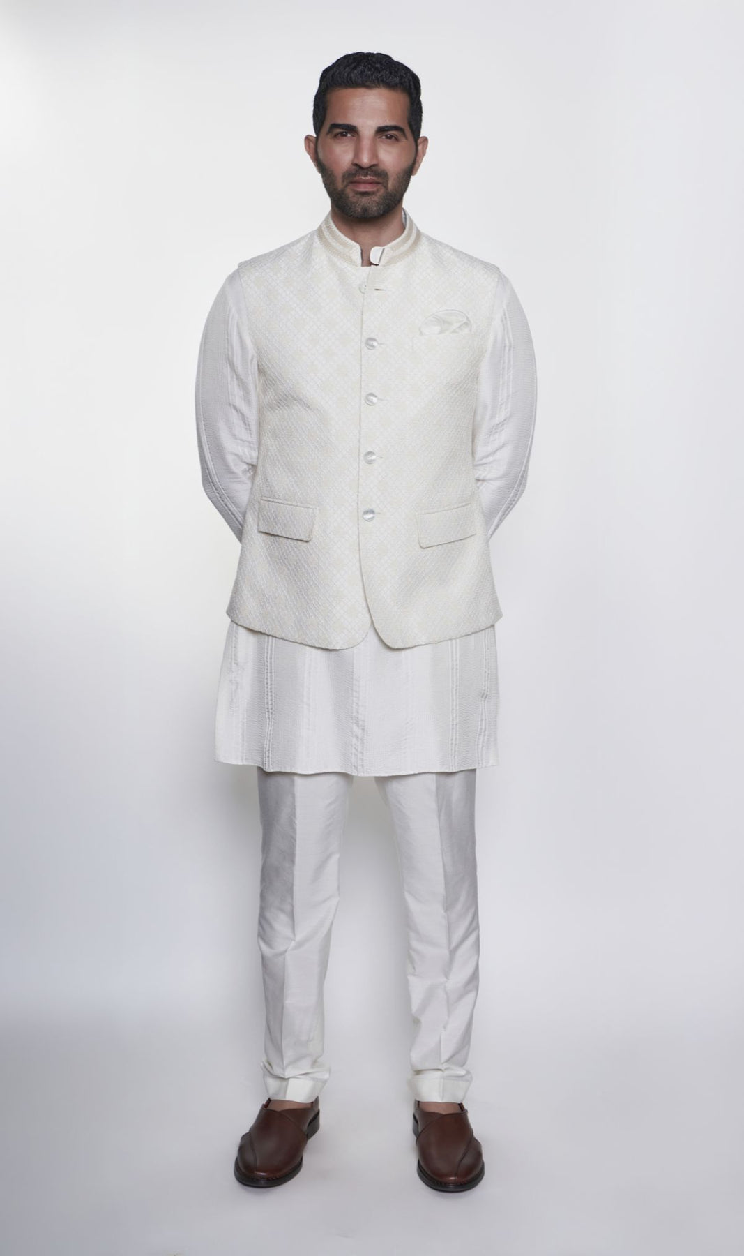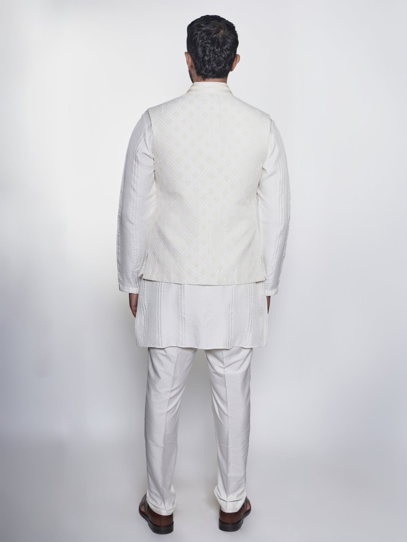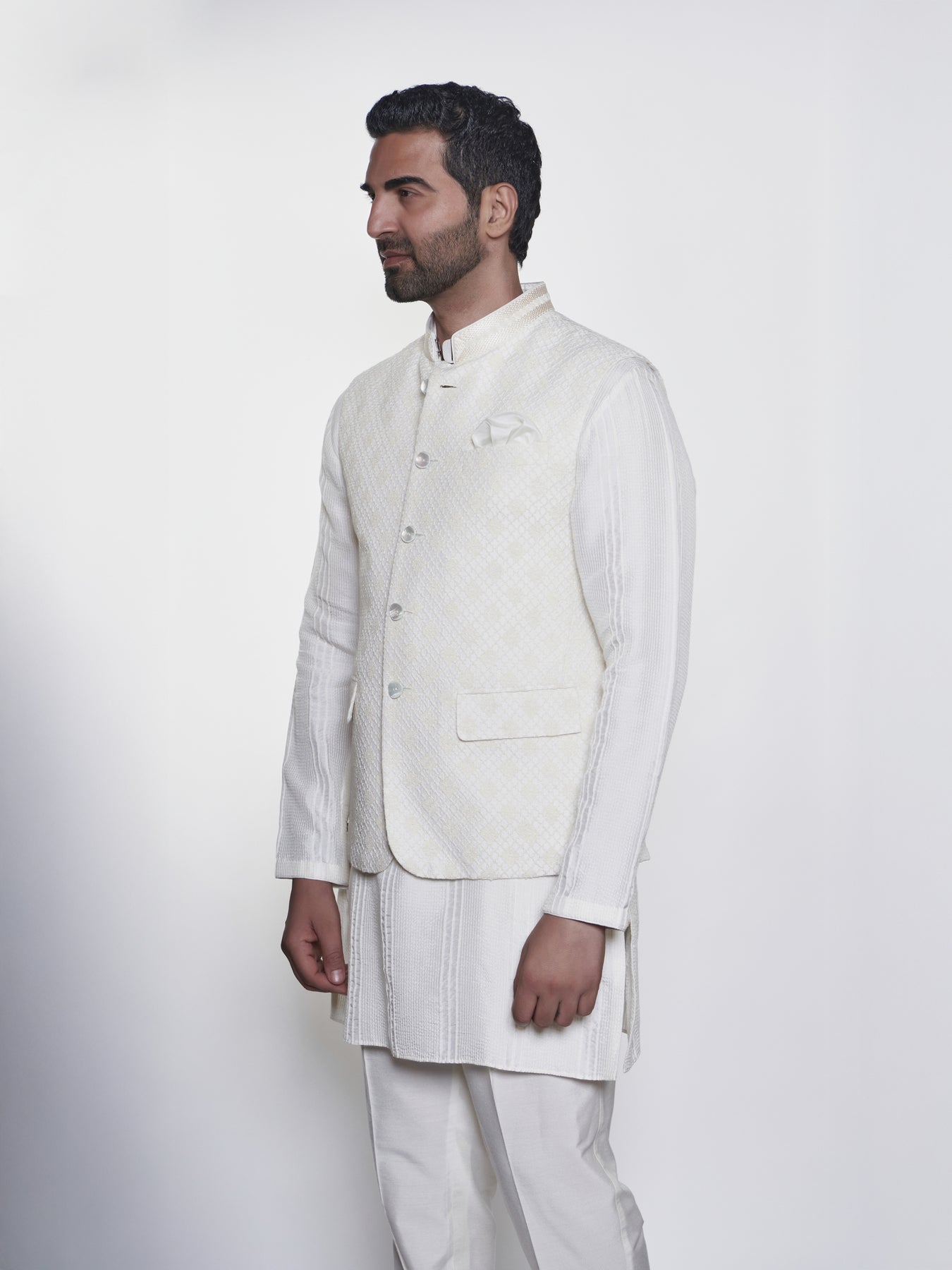 Regular price Rs. 65,000Ivory Square Jacquard Bundi with square formation dori spiral embroidery all-over.