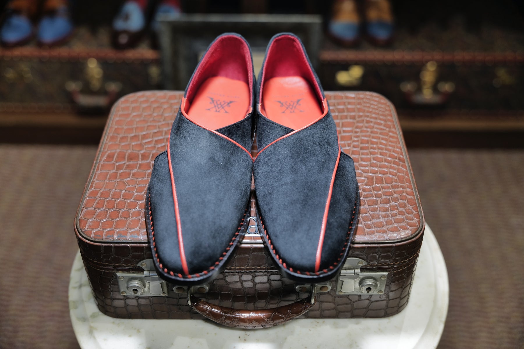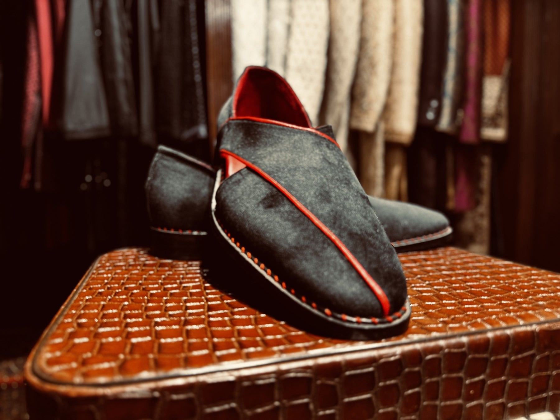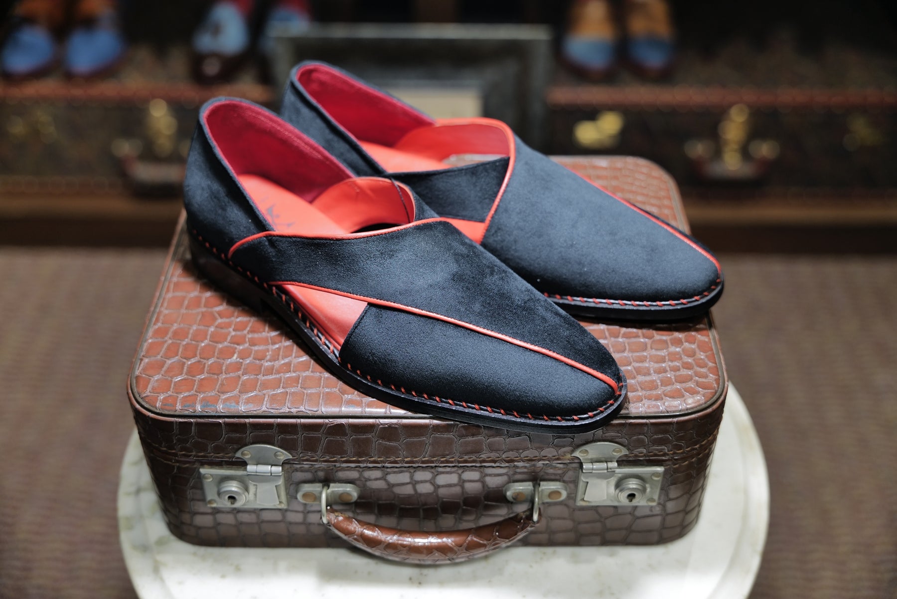 Regular price Rs. 20,000These are handcrafted pure leather and Velvet Black/Red Peshawaris - a uniquely Arjun Khanna style.