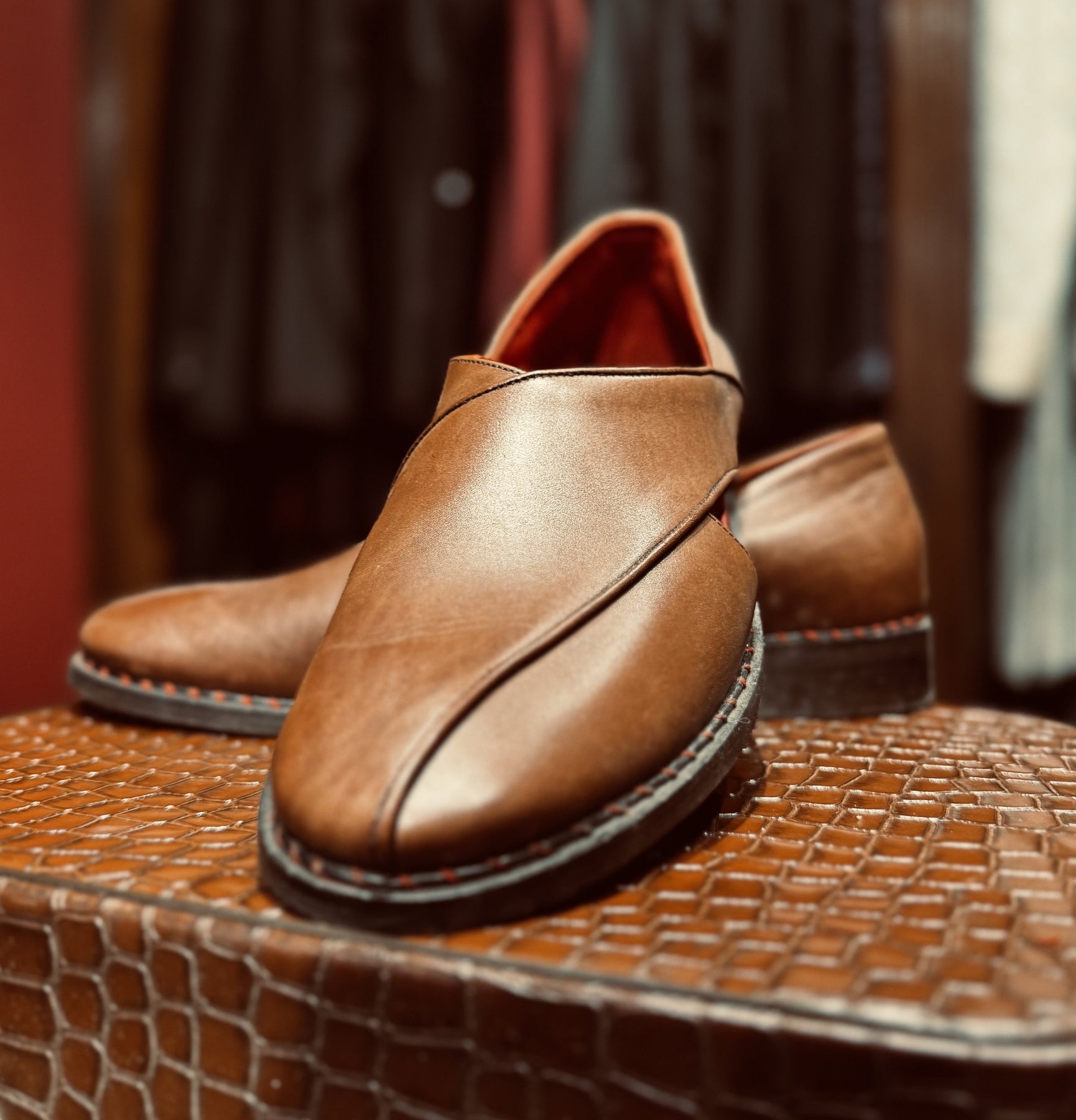 These are pure leather handcrafted Brown Peshawaris with signature Arjun Khanna detailing.
