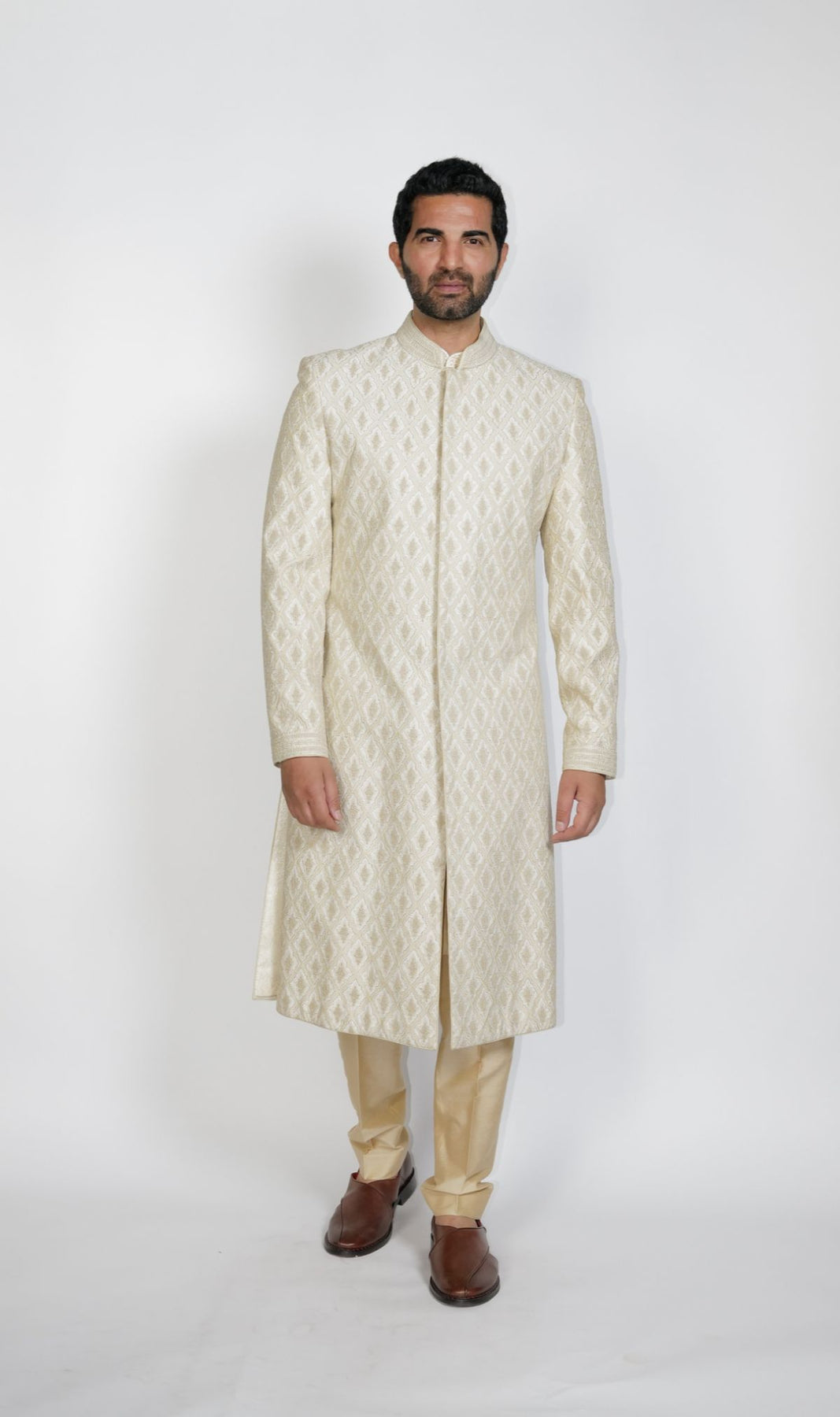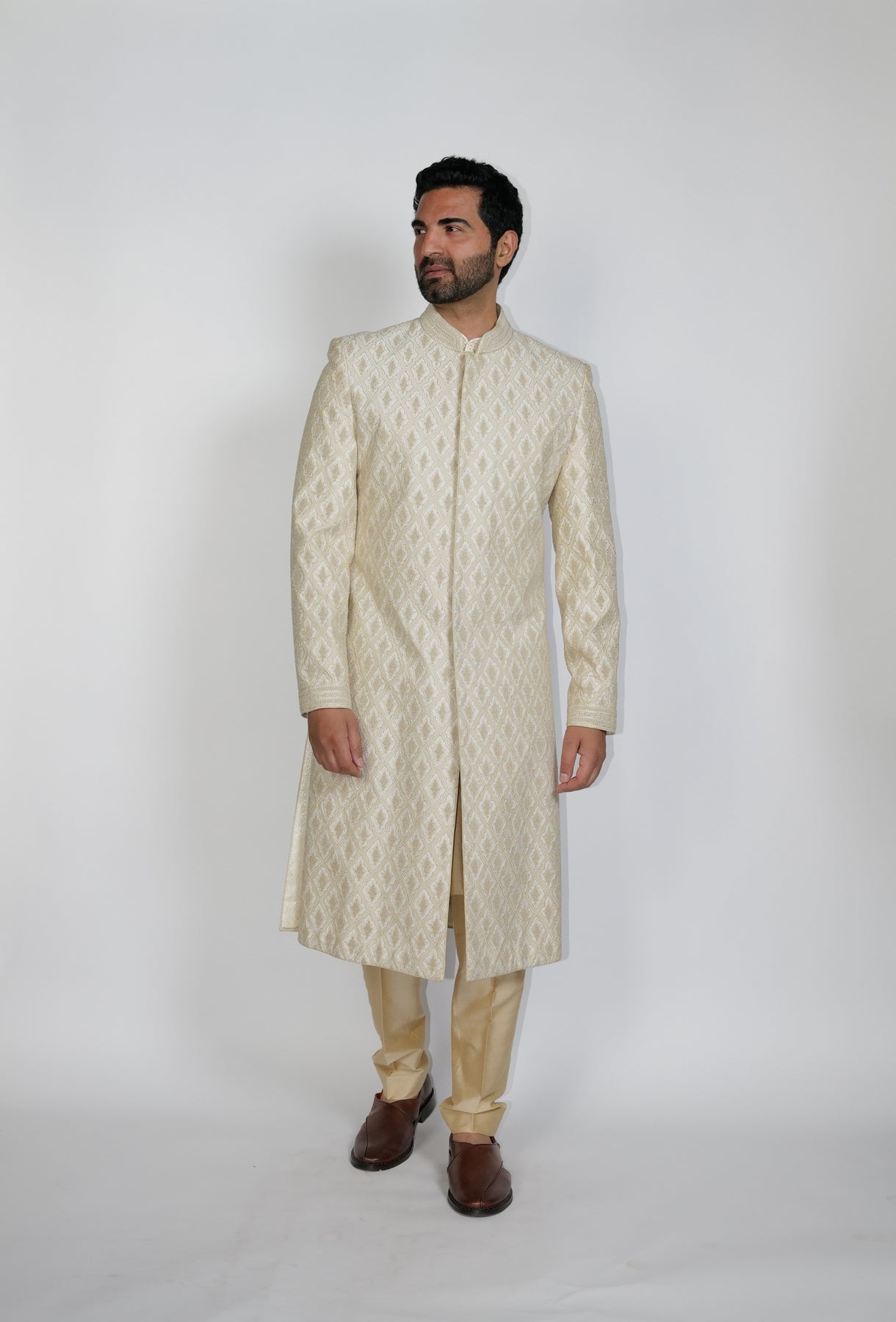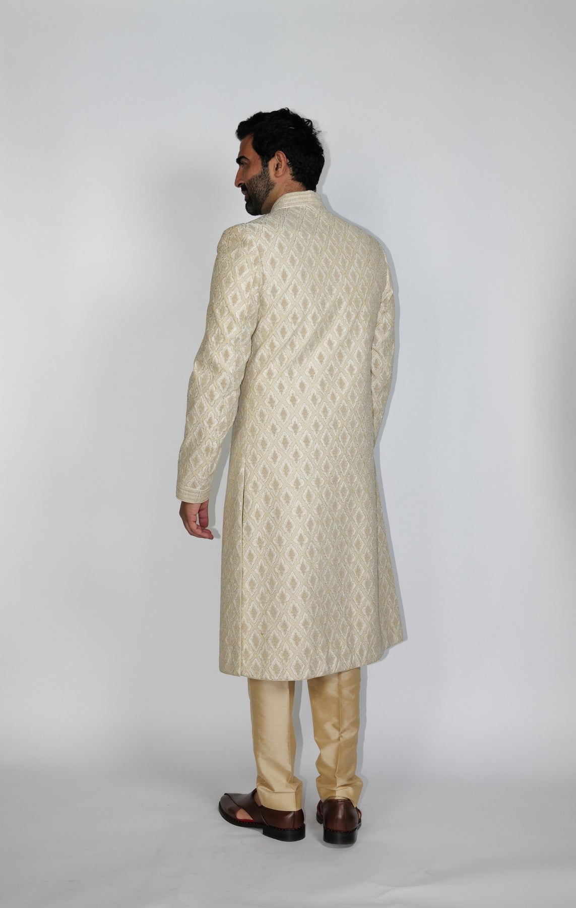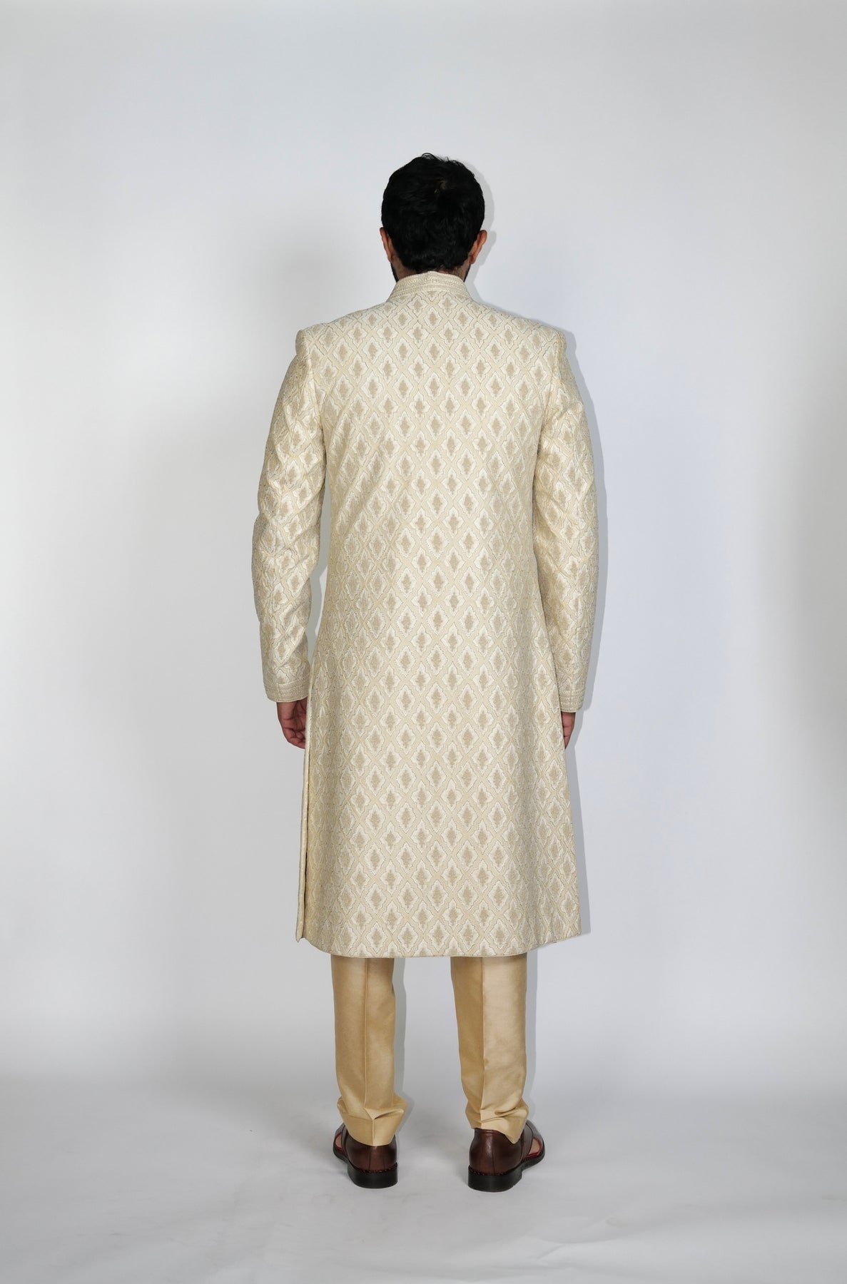 Regular price Rs. 210,000Beige and cream silk Sherwani intricately embroidered in doriwork and 3 layered cutwork. Classic and timeless.