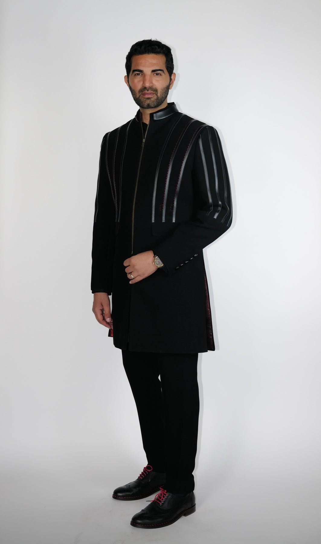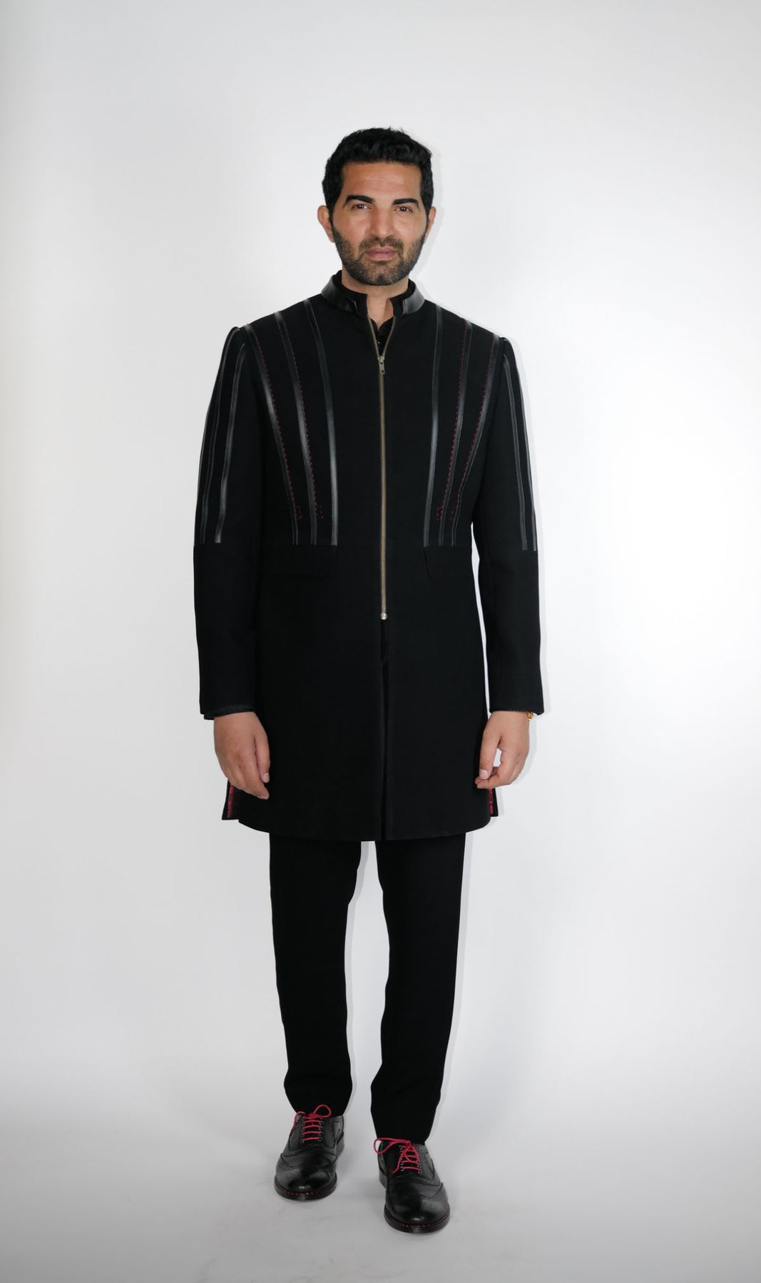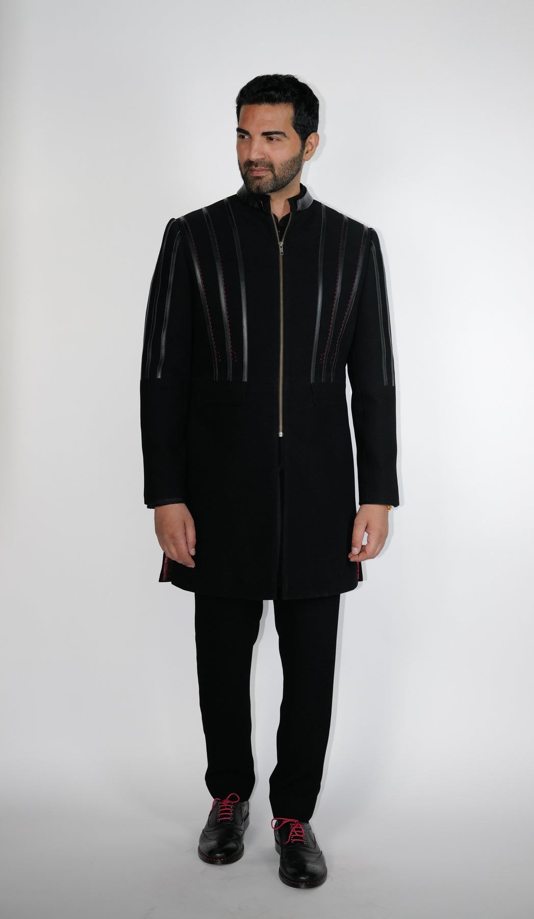 Black crepe wool Sherwani with leather & zipper details.