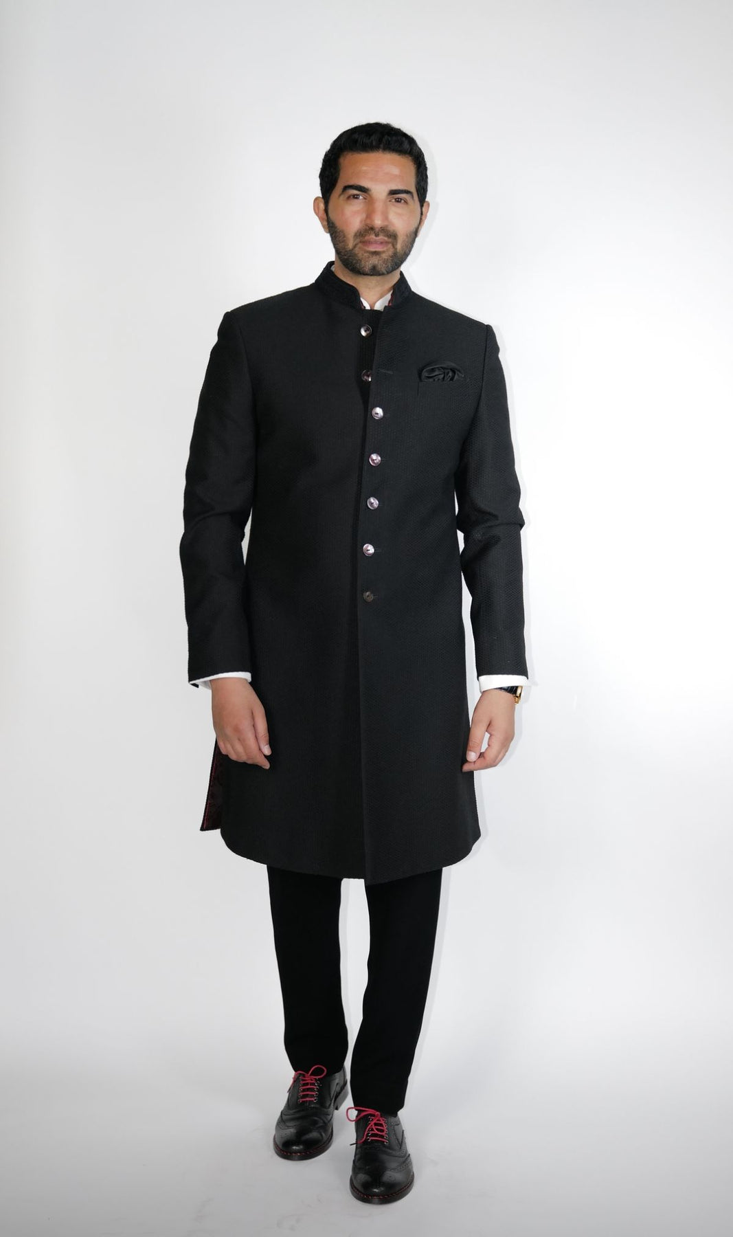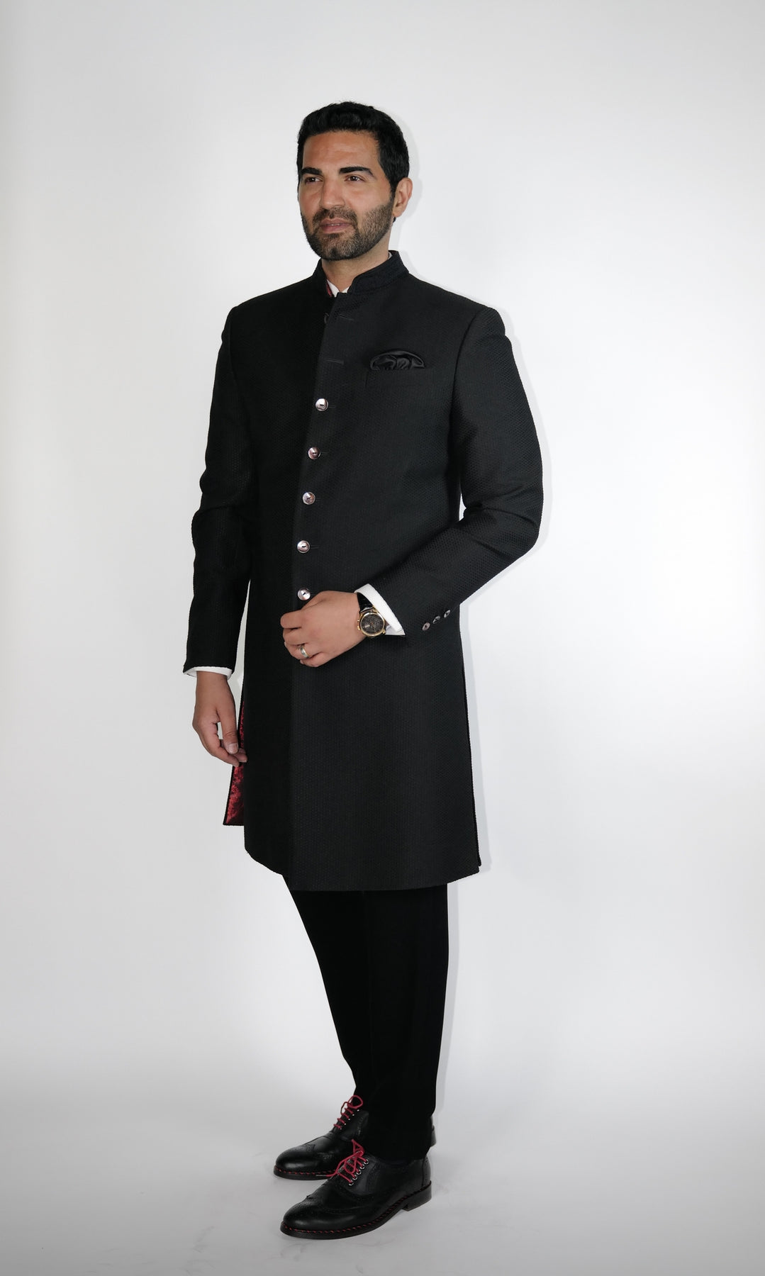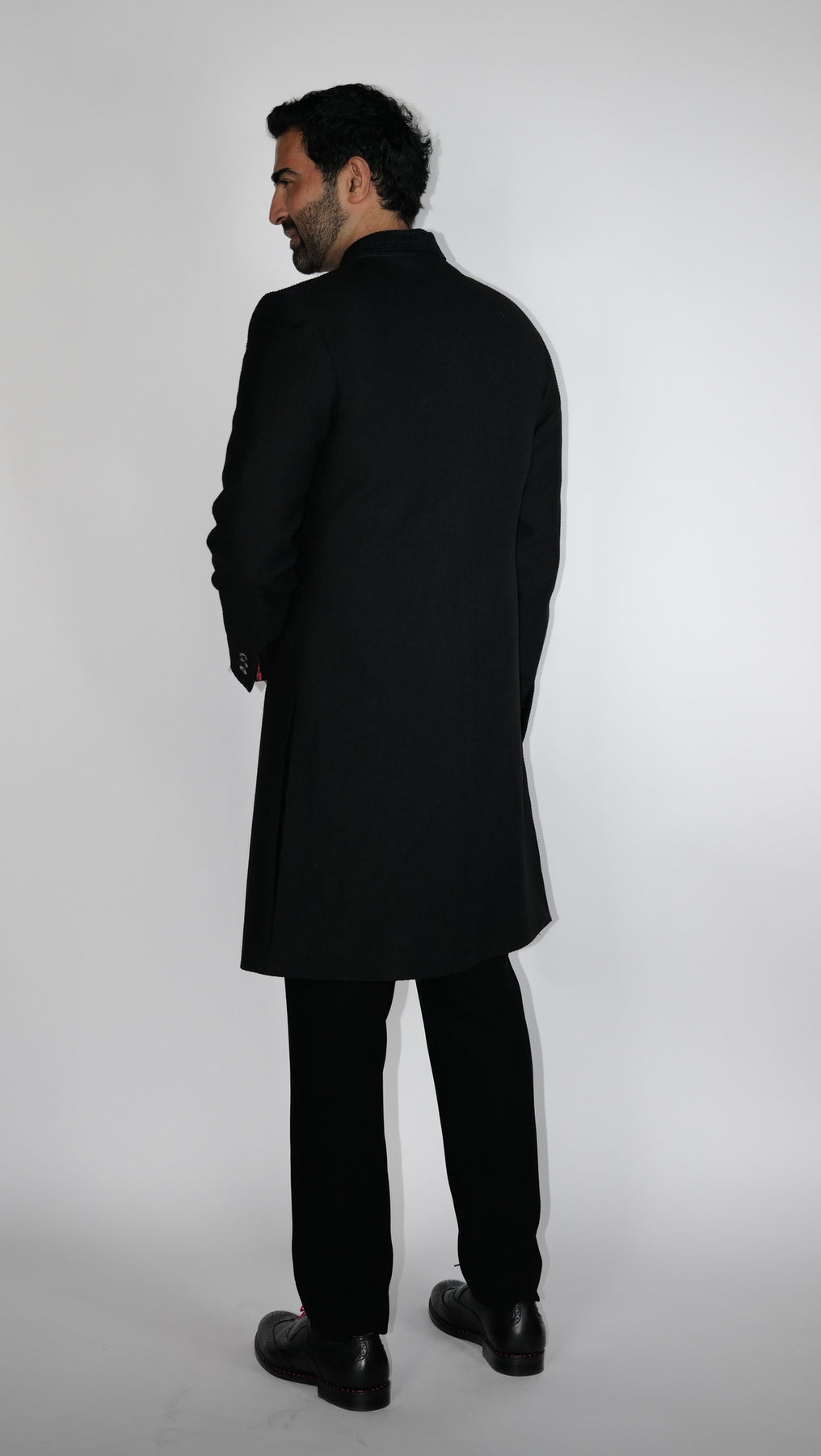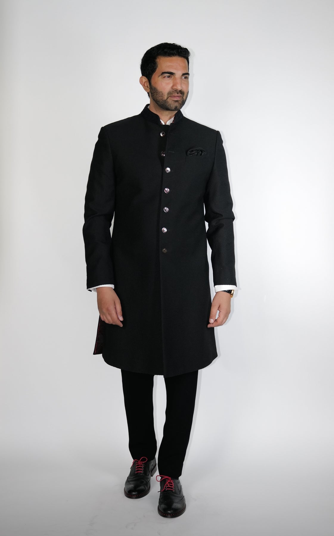 Regular price Rs. 98,000Classic Black textured crepe wool Sherwani with self dori embroidered collar, paired with under Kurta & Aligarhi.