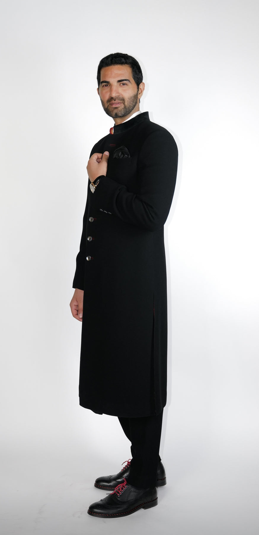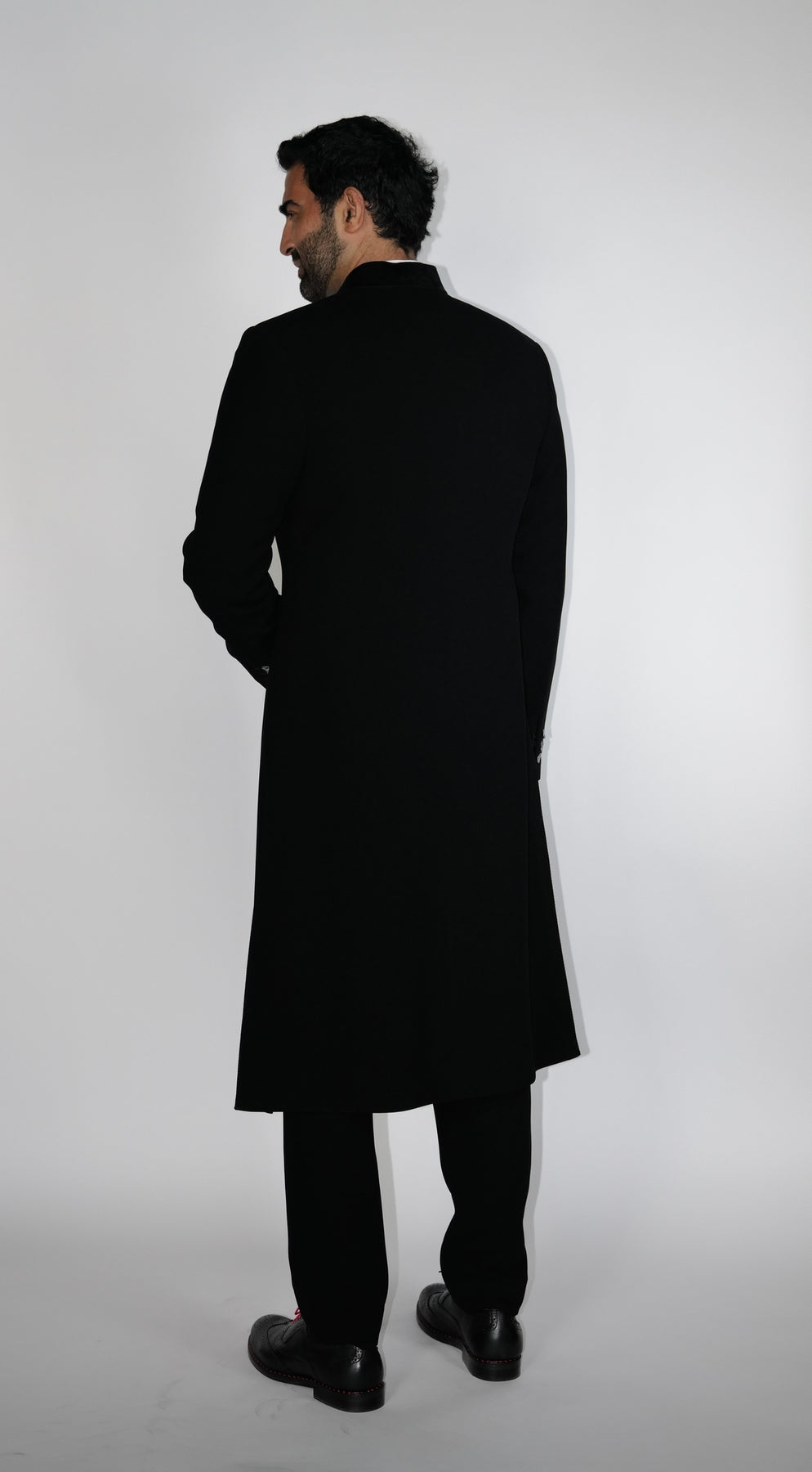 Regular price Rs. 98,000Classic Black crepe wool long Sherwani with velvet collar, paired with under Kurta & Aligarhi.