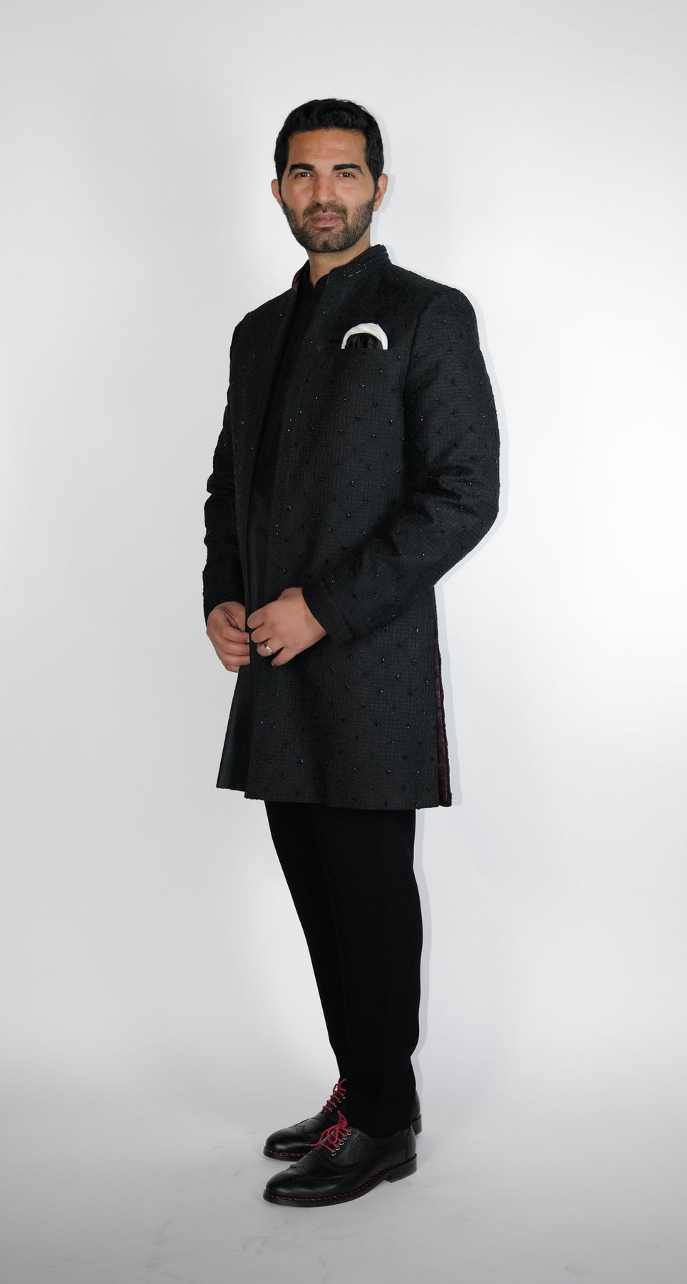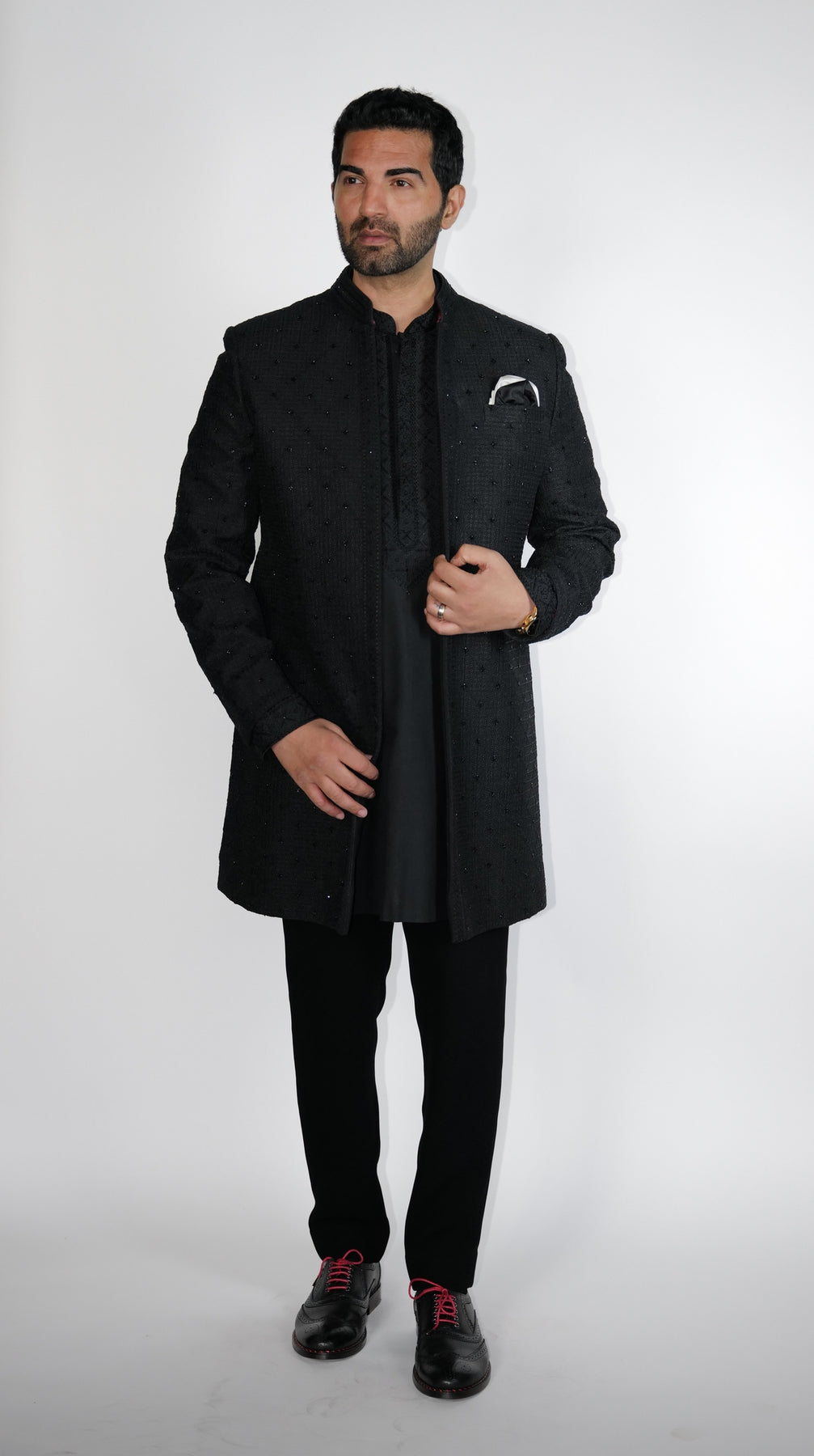 Black Square Jacquard with Dori work & Katdana open Sherwani with Black under Kurta & Aligarhi.