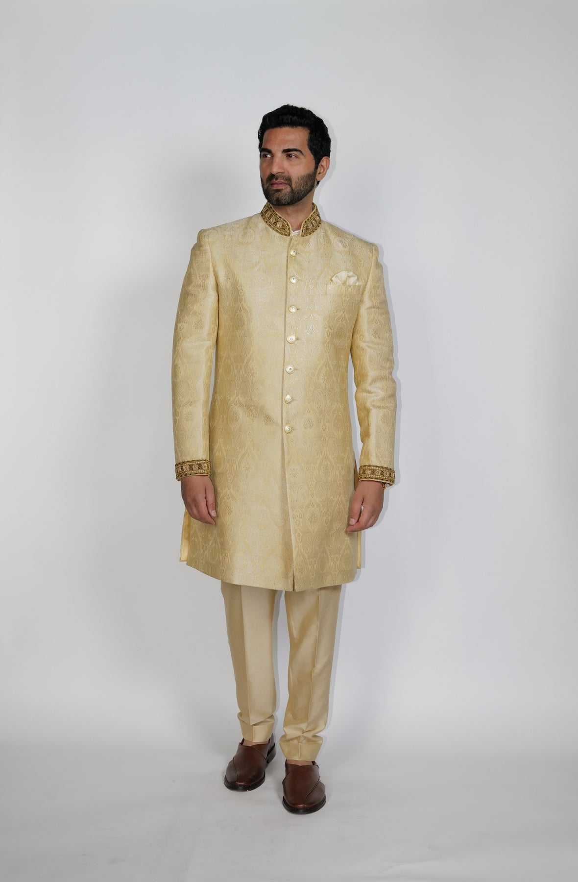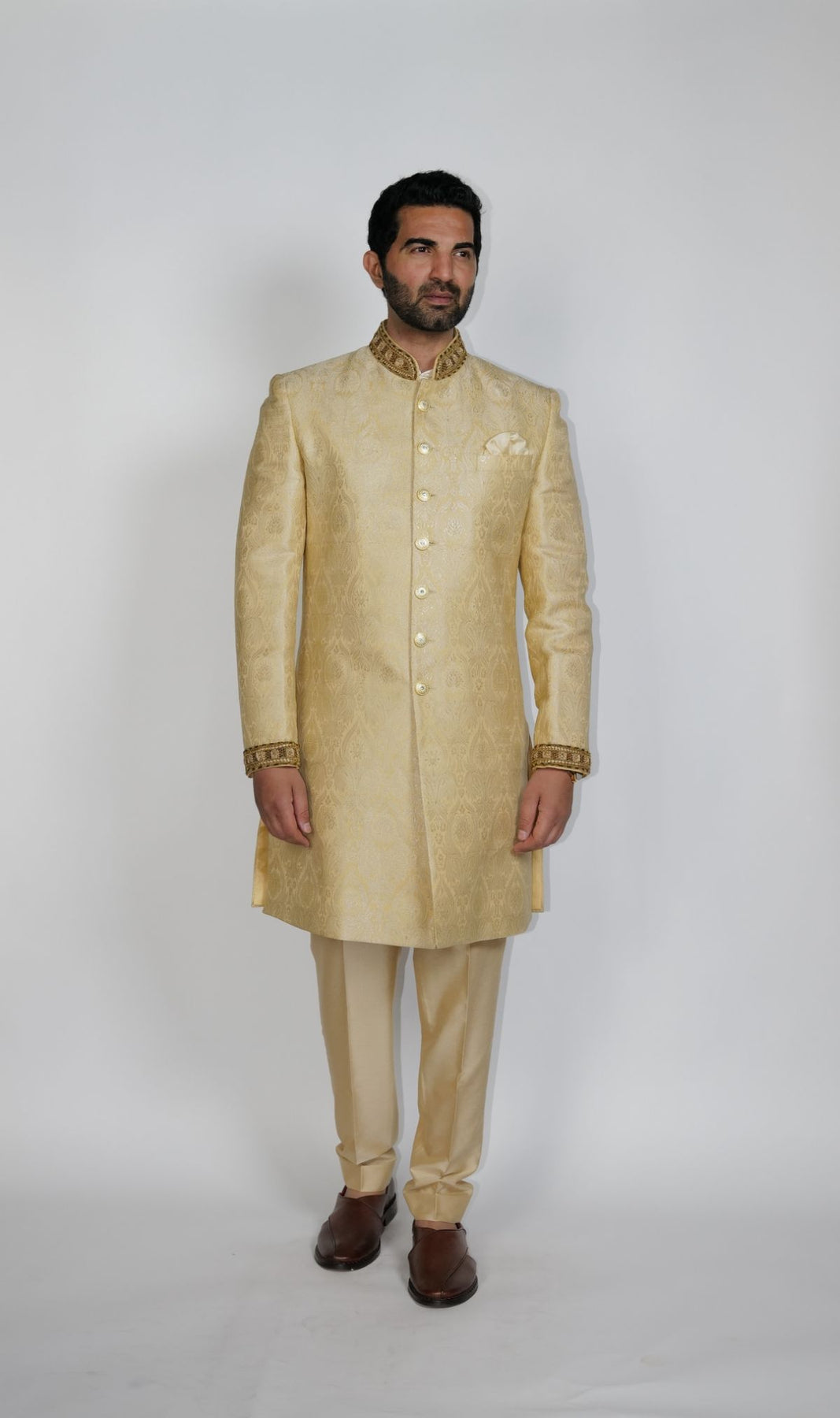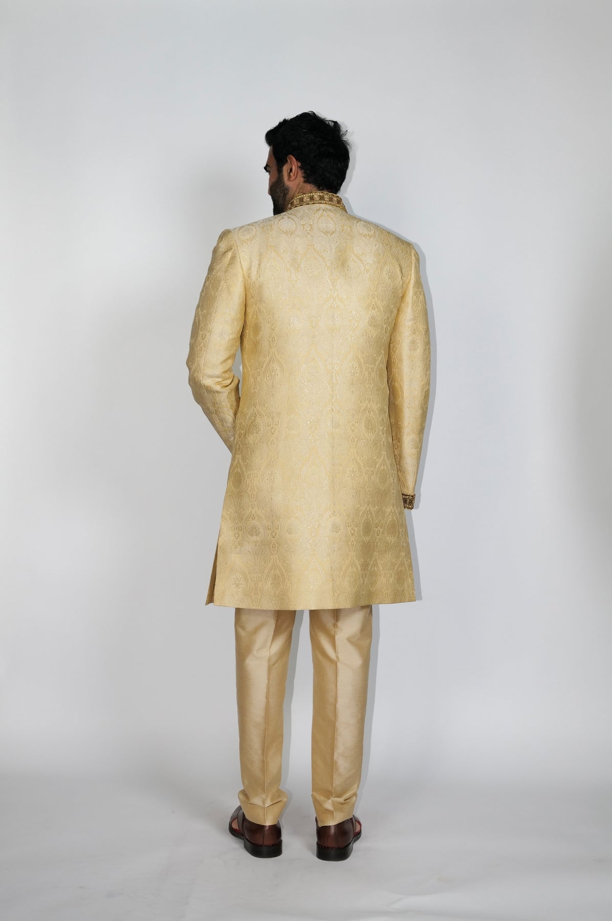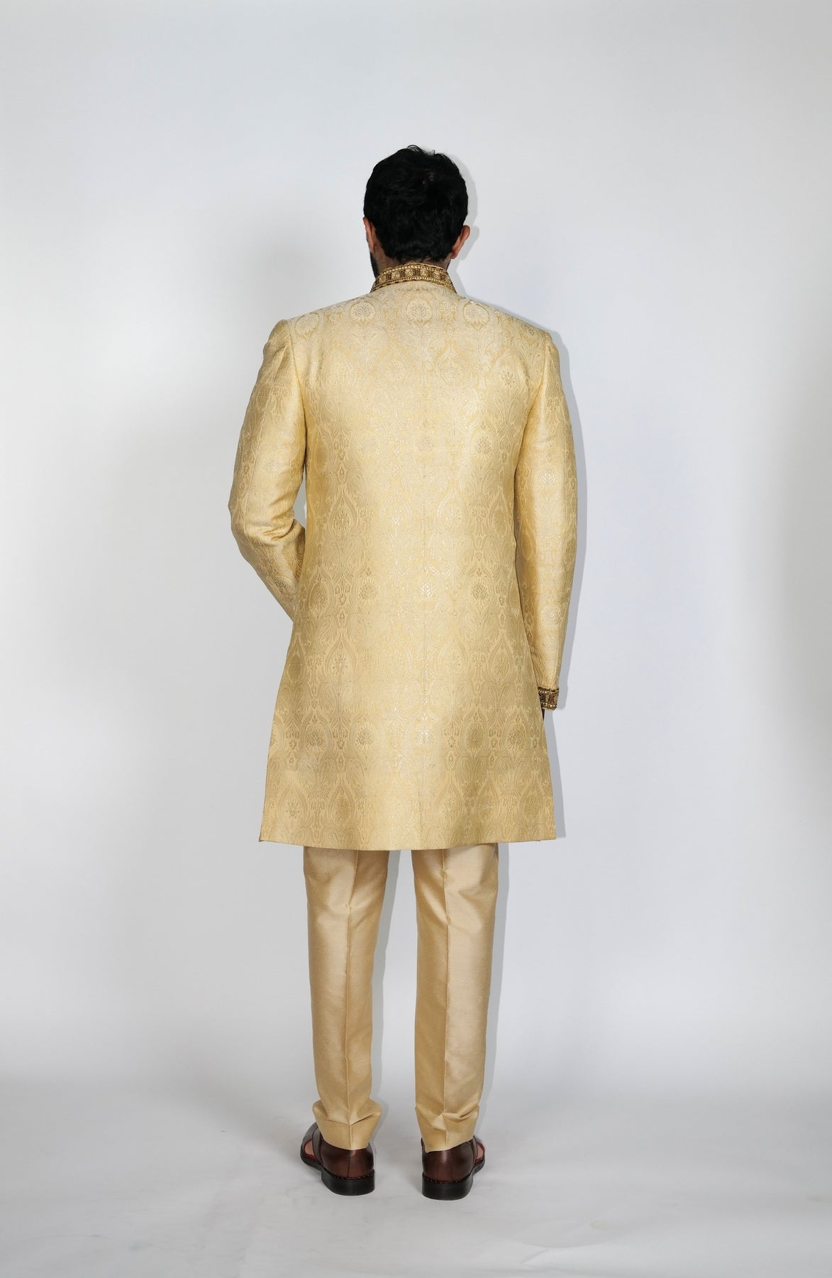 Regular price Rs. 98,000Elegant and regal Sherwani in sumptuous gold brocade. Richly embroidered collar and cuffs. Worn with cotton silk kurta and Aligarhi. Be a royal groom in this classic timeless garment.