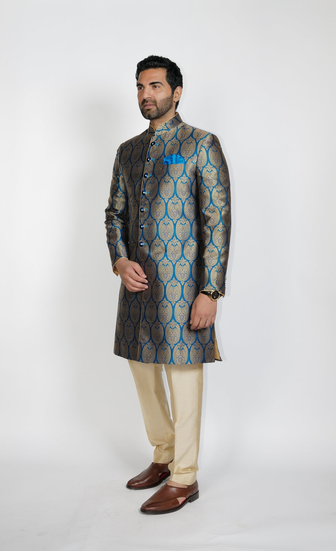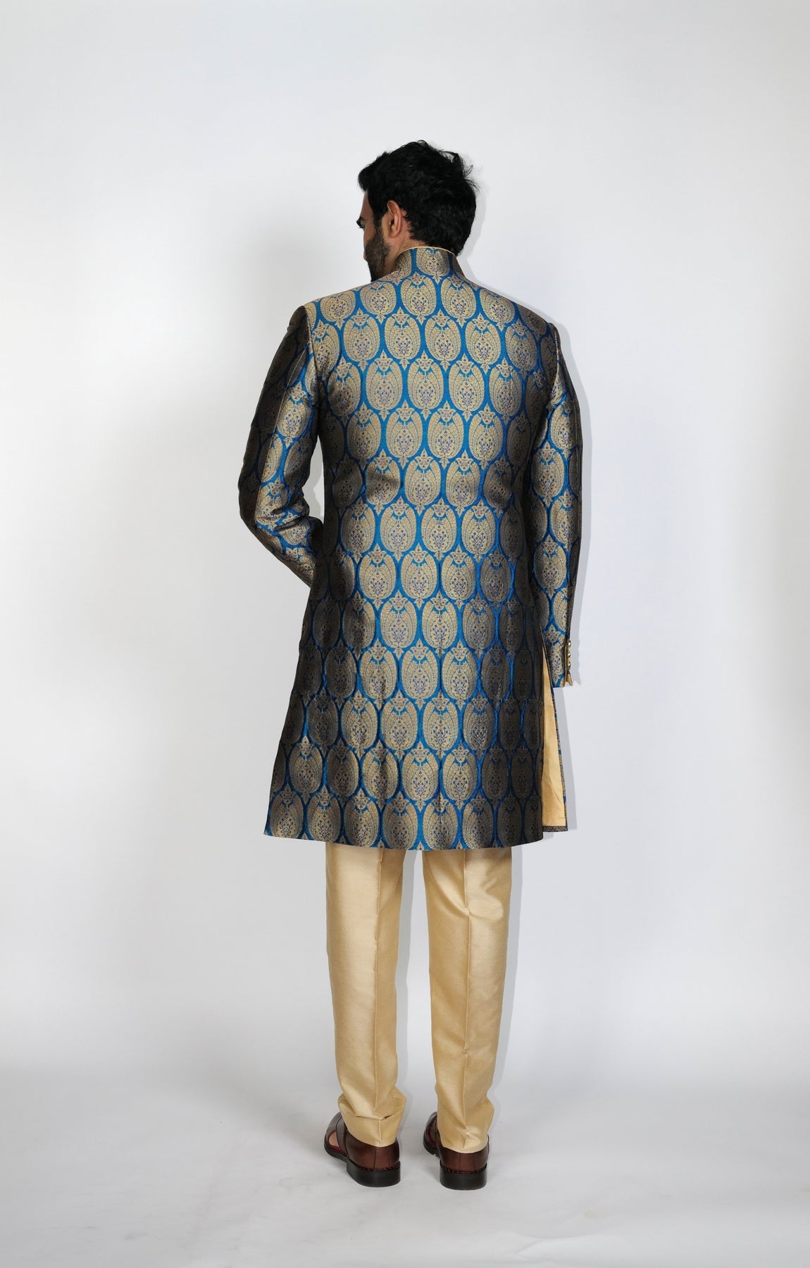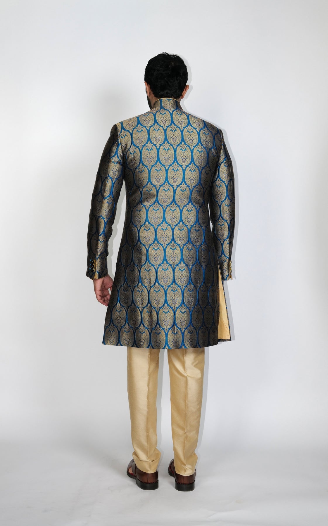 Regular price Rs. 95,000Sumptous Benarasi silk brocade in beautiful peacock tones in a classic style. Worn with cotton silk kurta and Aligarhi. A beautiful classic Sherwani for any occasion.