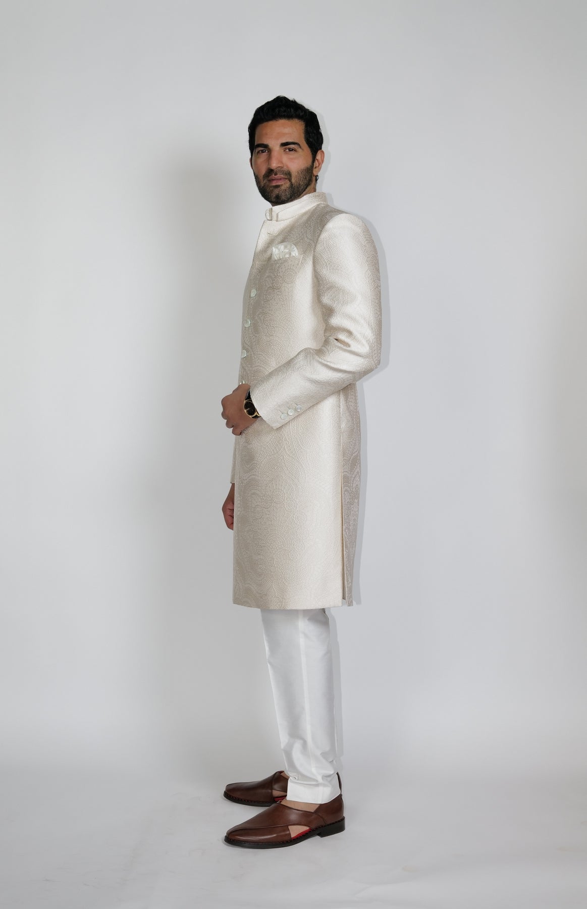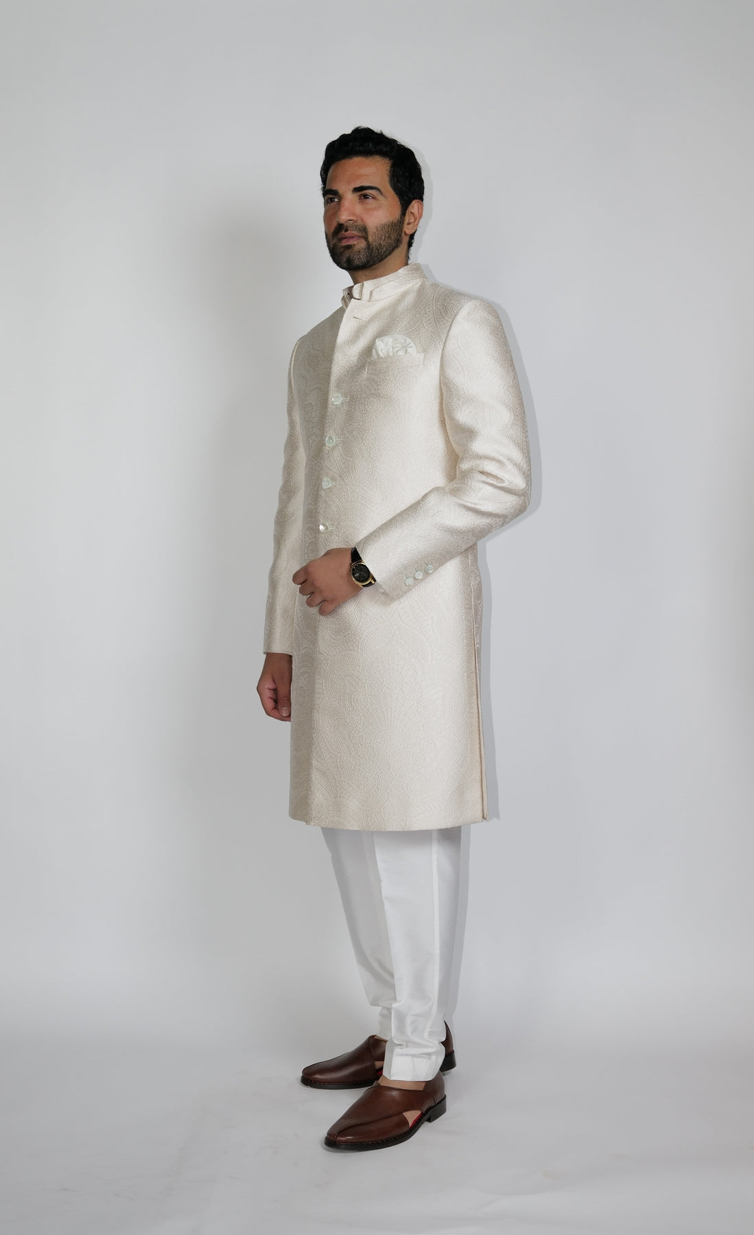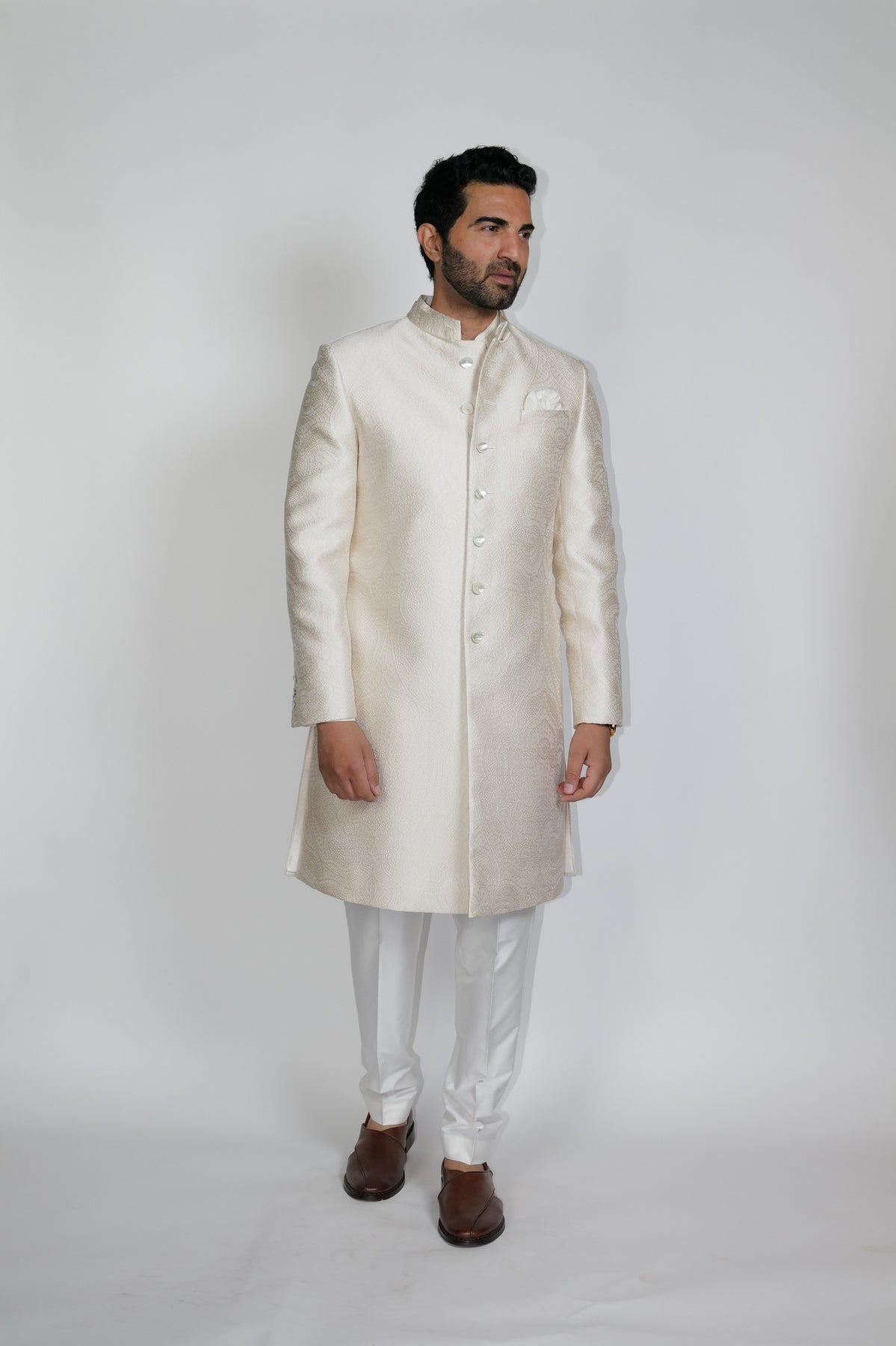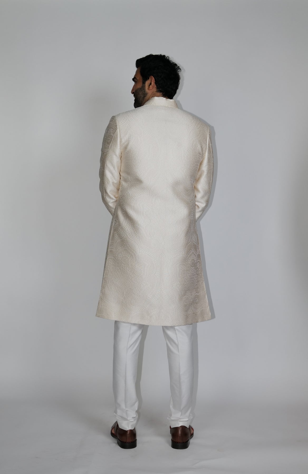 Regular price Rs. 98,000Classic double collar self-Jacquard Jaal Sherwani in a light biscuit color paired with under Kurta & Aligarhi.